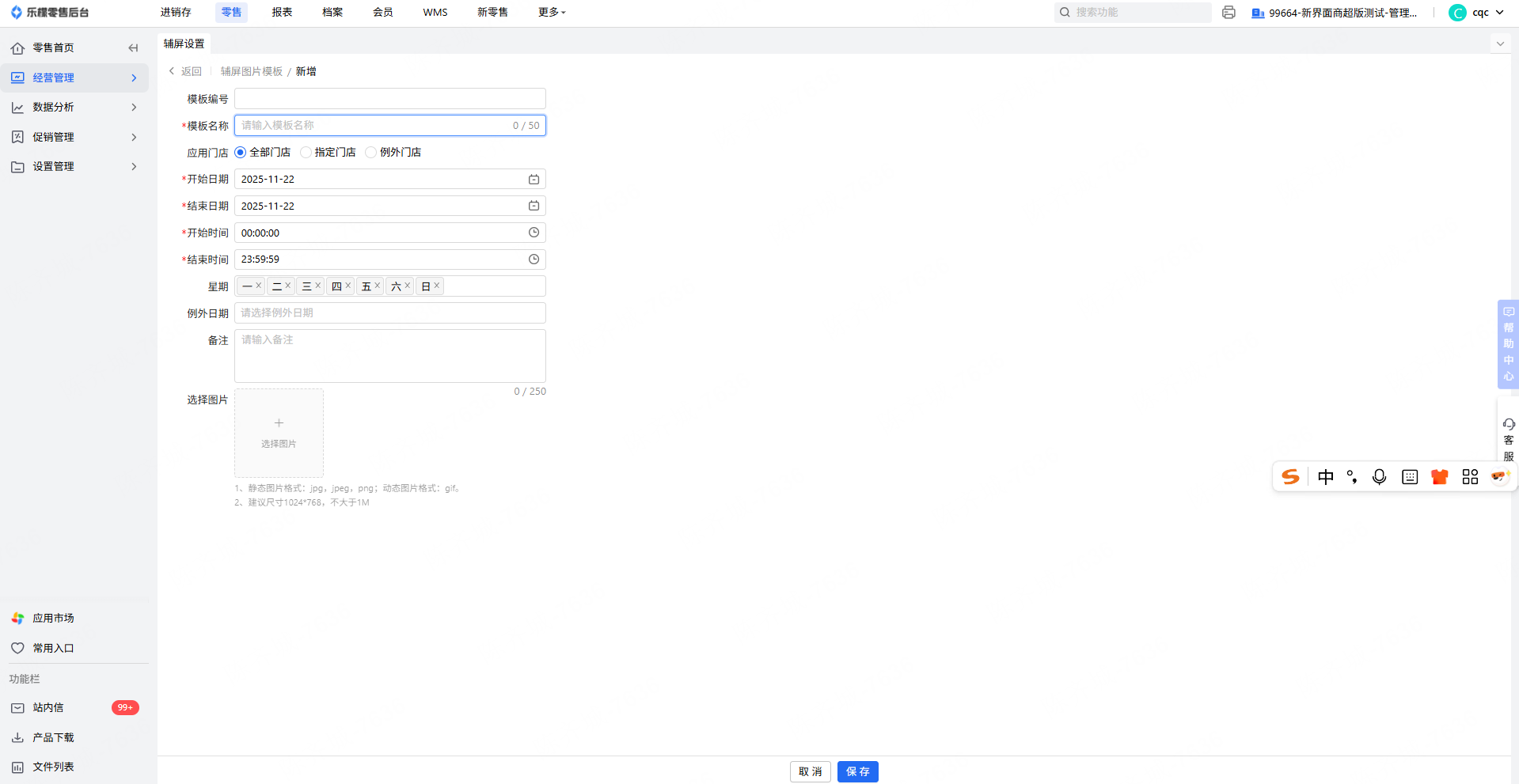设置相应的模板应用门店、时间、图片后点击保存,保存后前台进行数据同步即可