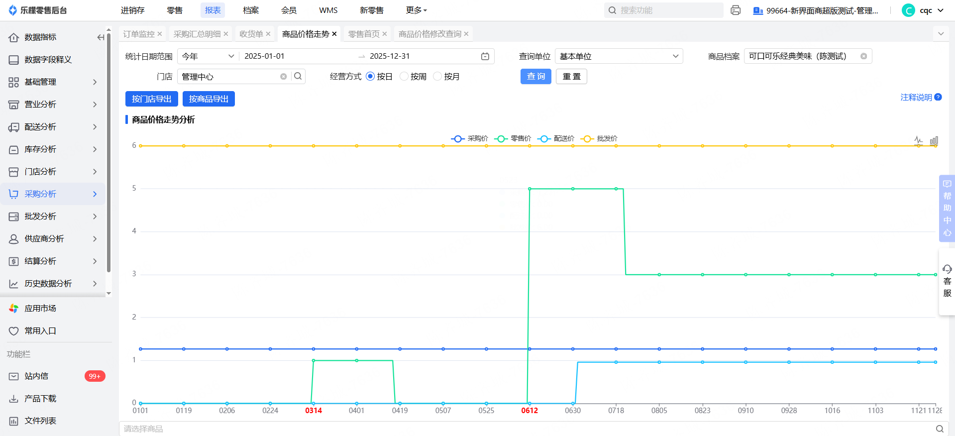 采购价:管理中心=采购单价变动记录;门店=中心配送给分店+分店采购收货的价格;