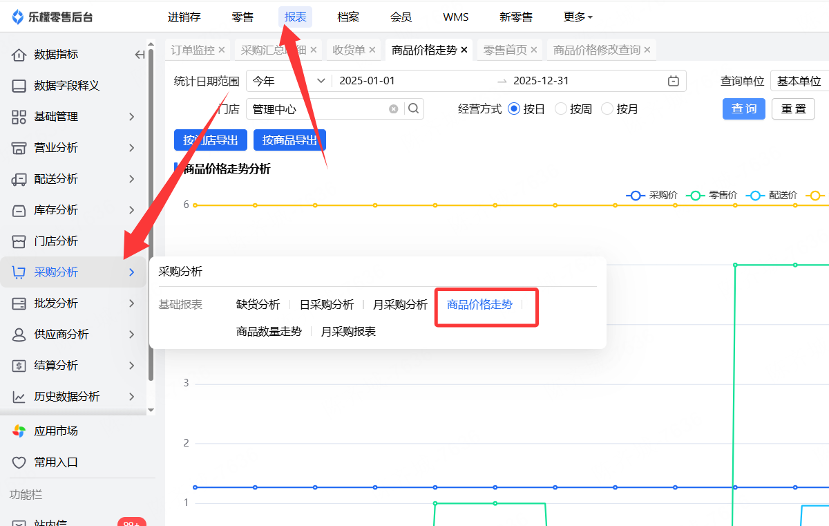 👉【操作路径】:·报表-采购分析-基础报表-商品价格走势