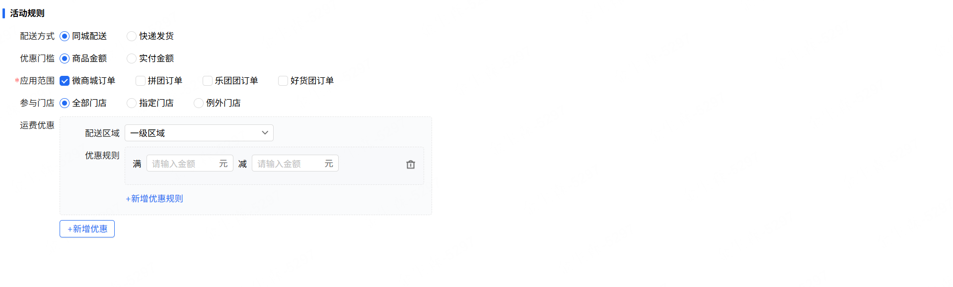 3、设置活动规则,配送方式、门槛方式、参与门店和优惠层级