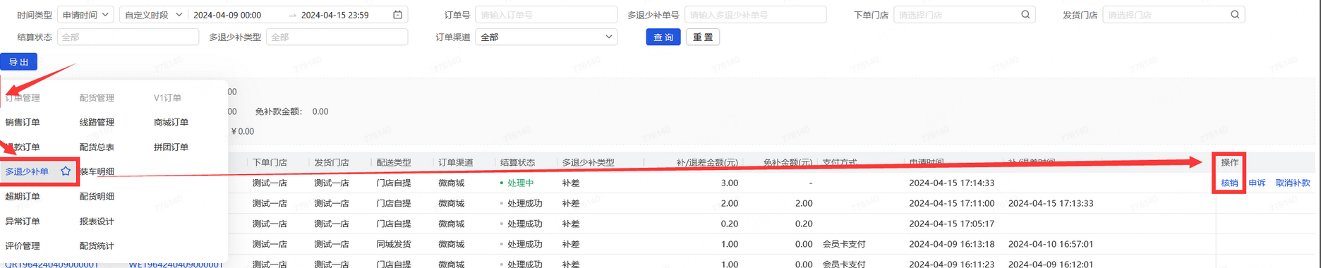 👉【操作路径】:·新零售-订单管理-多退少补单-核销