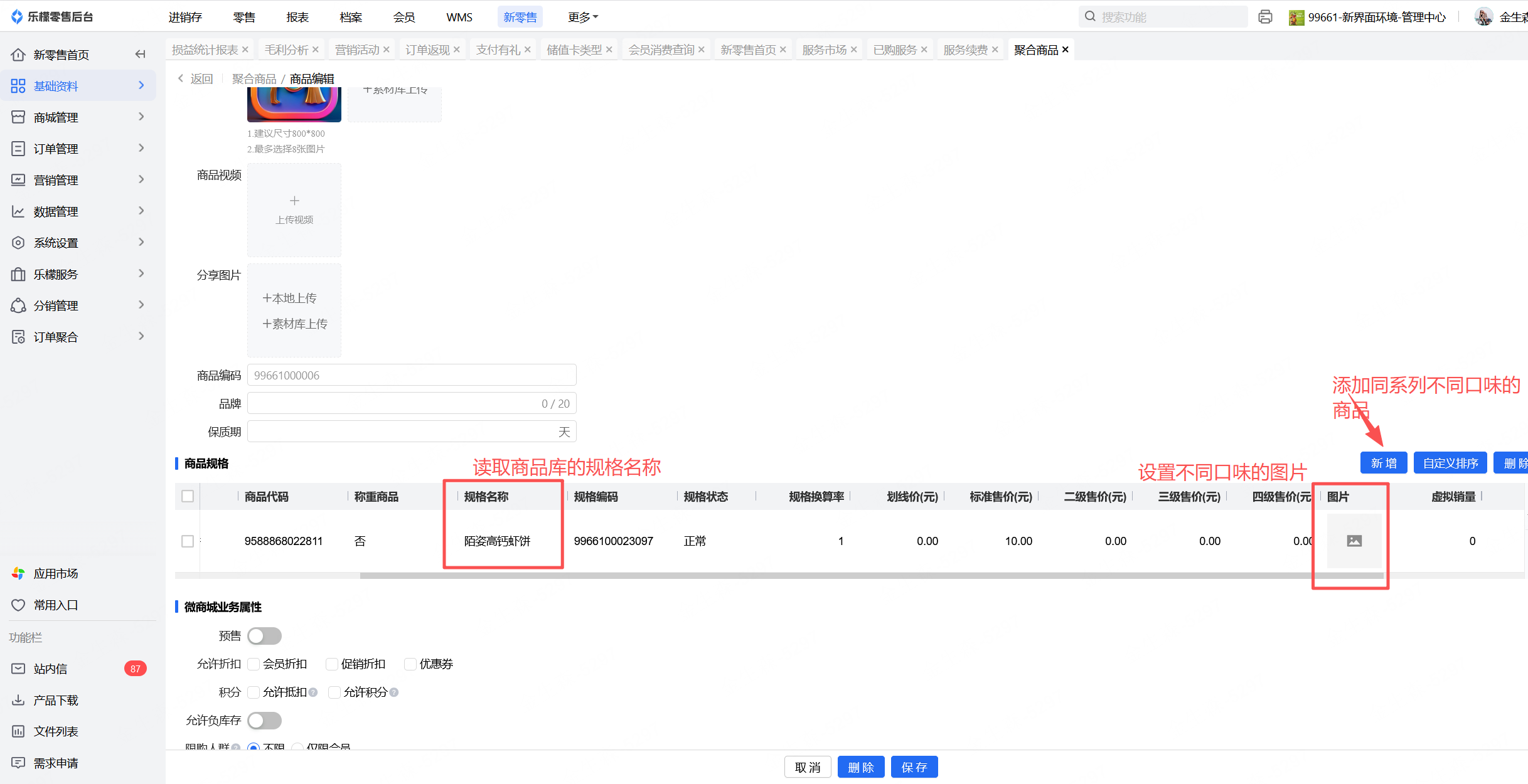 聚合商品新增界面与商城商品库操作一致,不同的是商品规格处进行添加不同口味的商品库商品、规格商品名称读取商品库商品名称,价格默认读取商品库的价格,若需要调整需要通过商品调价单进行调整
