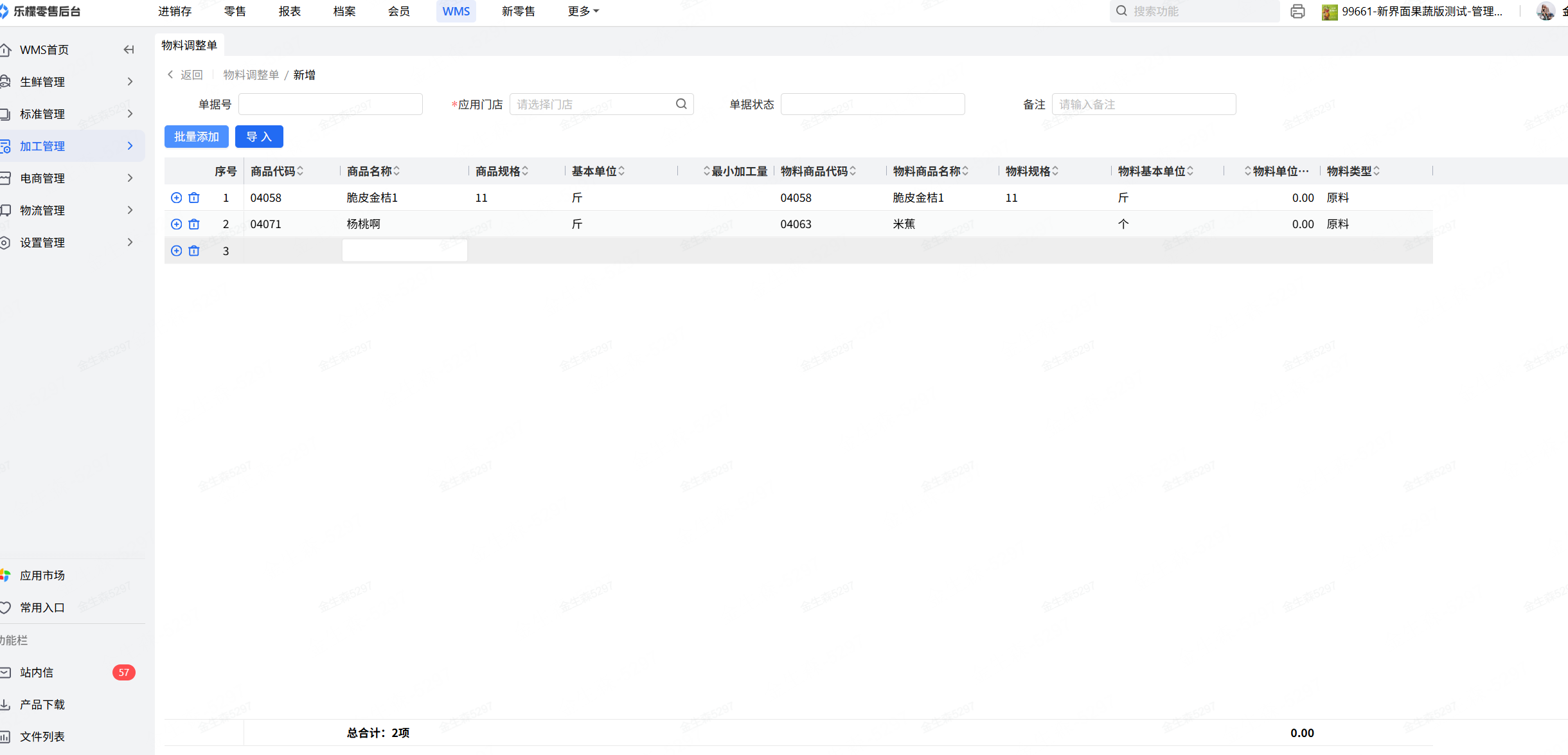 1、新增物料调整单