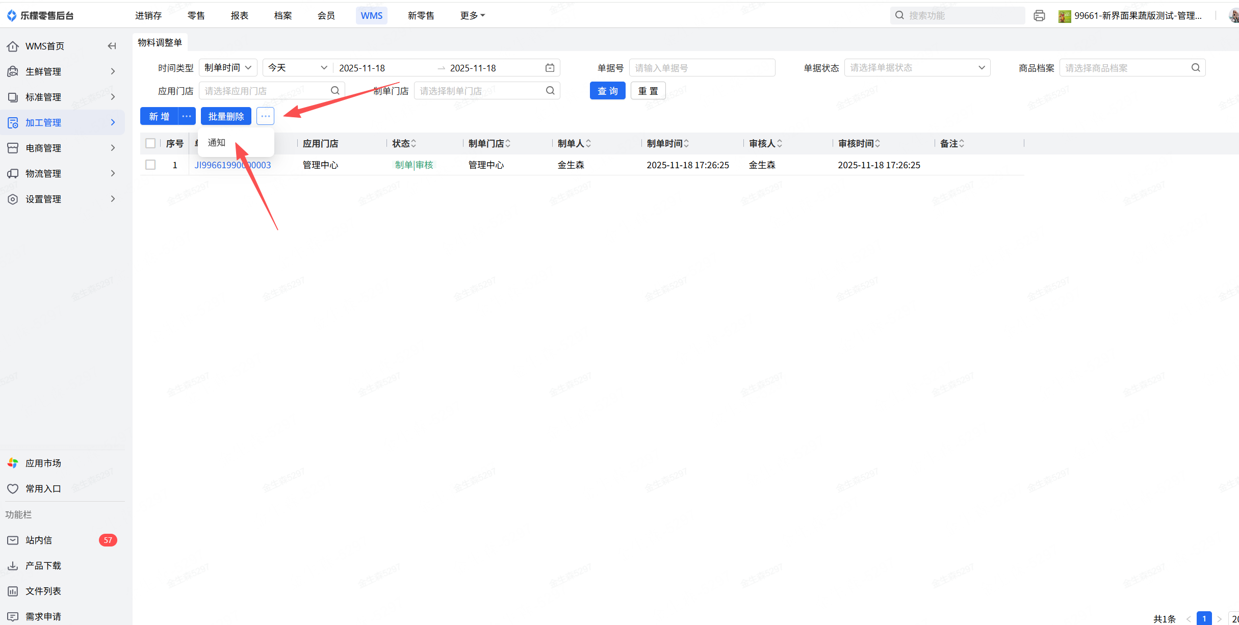 审核状态的物料调整单允许点击通知,发送留言到应用门店的所有用户