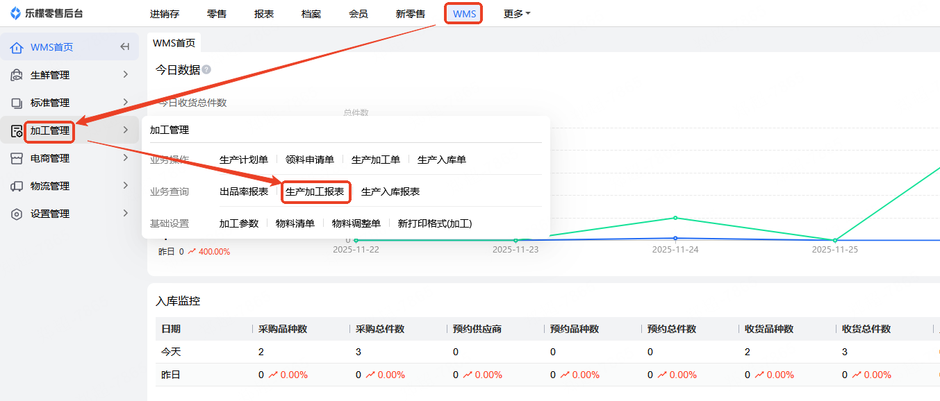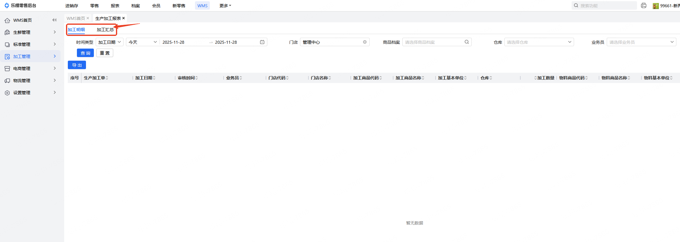 👉【操作路径】:·WMS-加工管理-生产加工报表