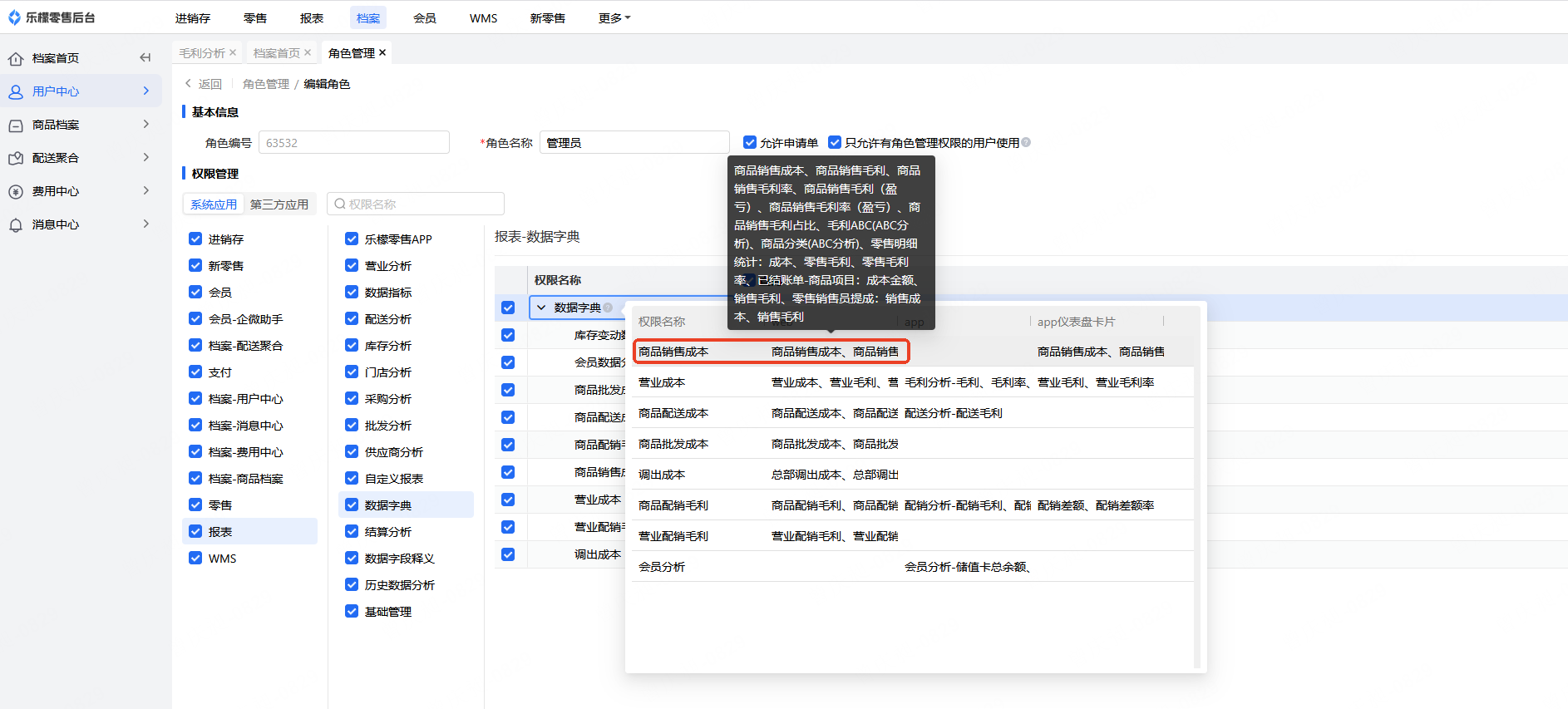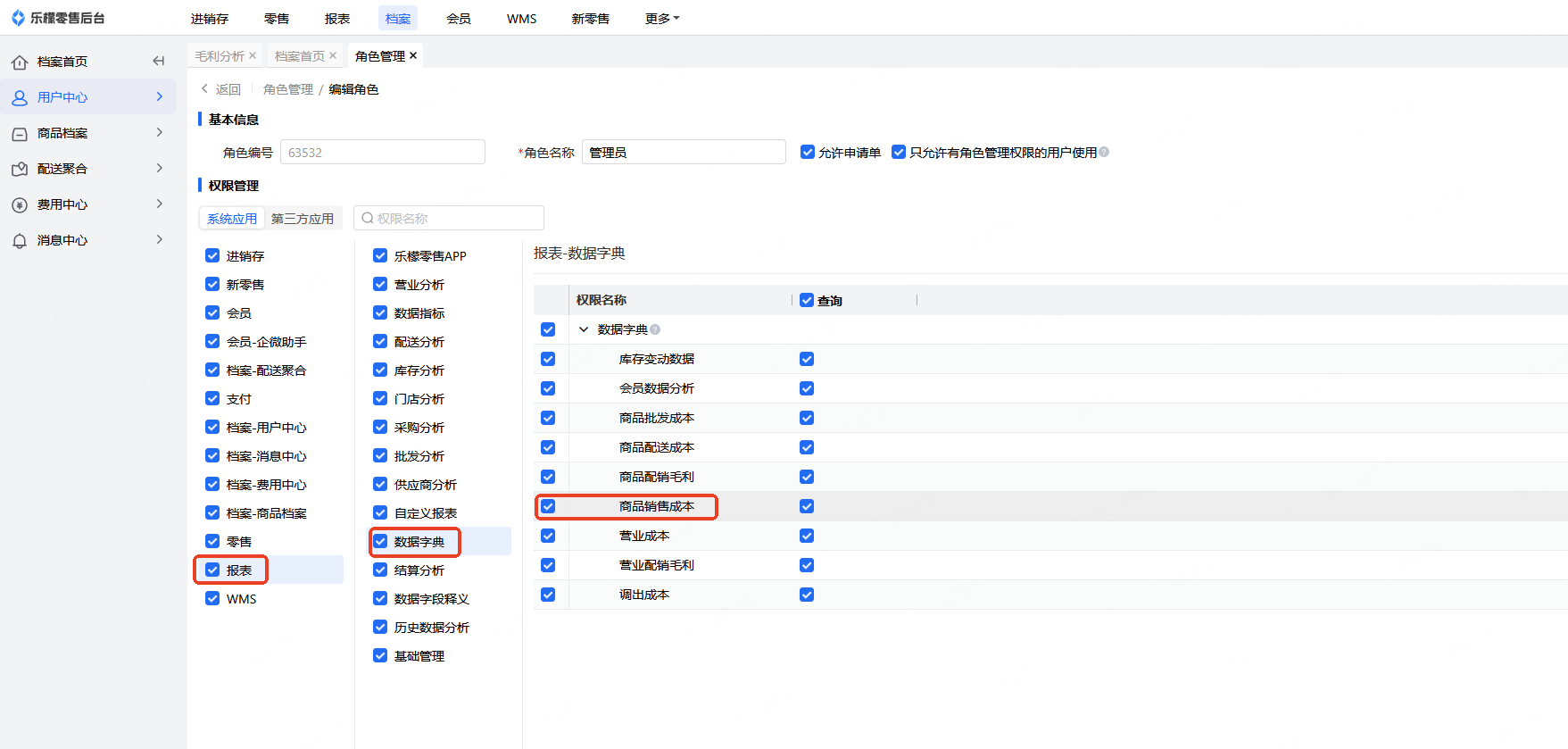 把对应角色的,报表-数据字典-商品销售成本 权限勾选