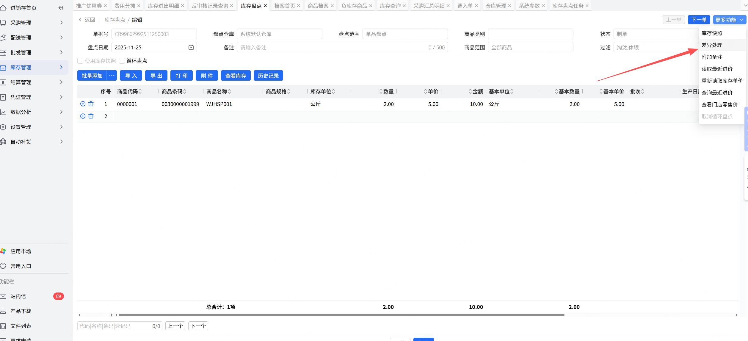 👉【操作路径】:·进销存-库存管理-库存盘点-差异处理