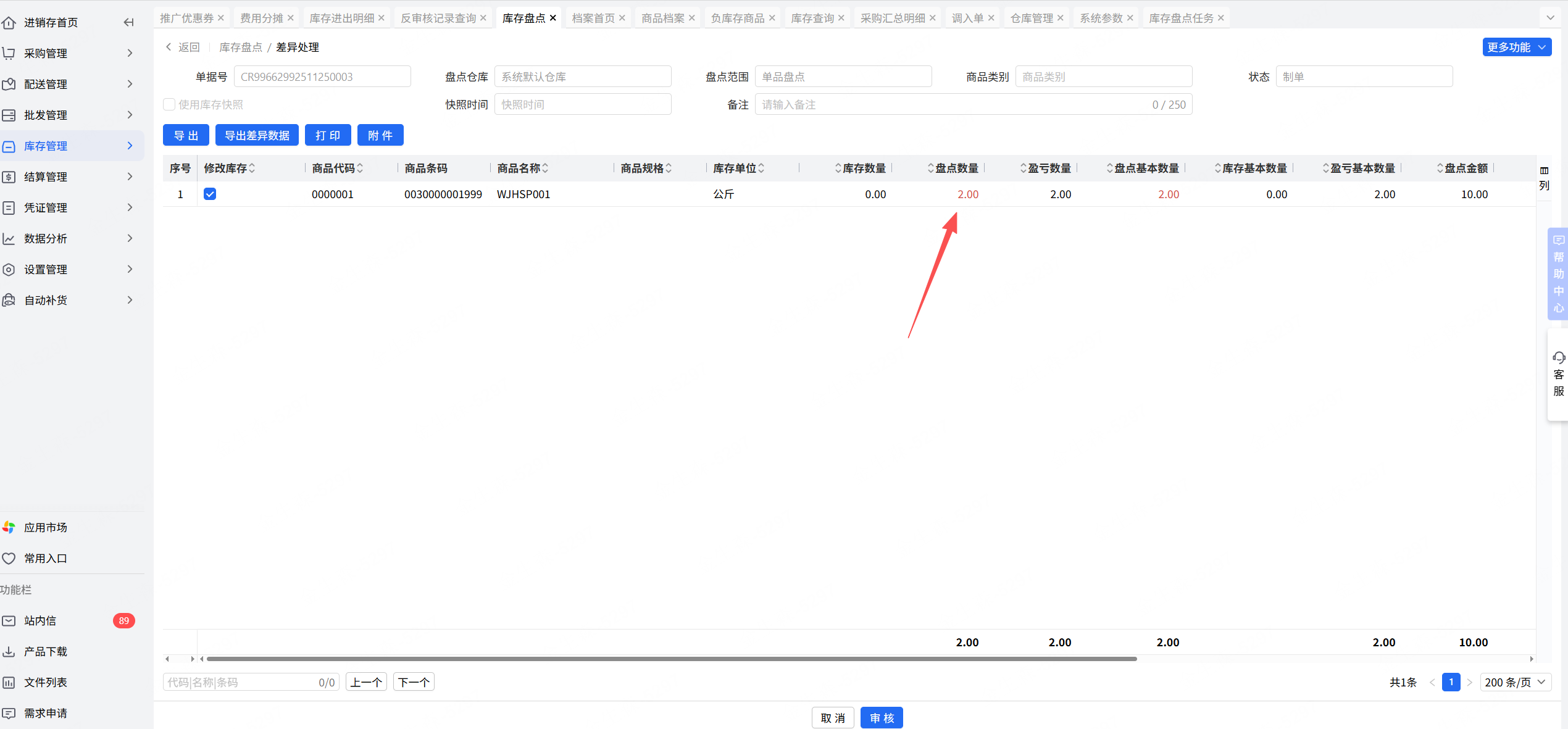 在差异处理中可查看到商品的库存数量和盘点数量,如下图库存数量为0,单盘点数量为2,即代表盘盈2个