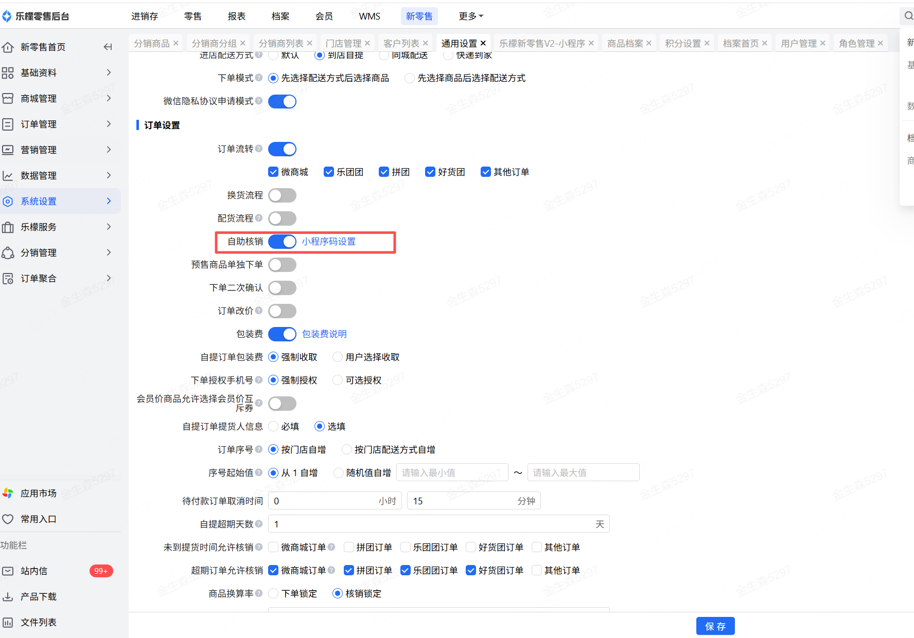 👉【操作路径】:·乐檬新零售-系统设置-通用设置-自助核销