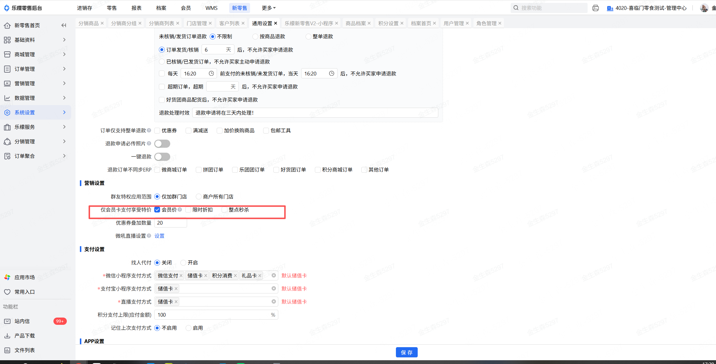 👉【操作路径】:·新零售-系统设置-通用设置-仅会员卡支付享受会员特权价