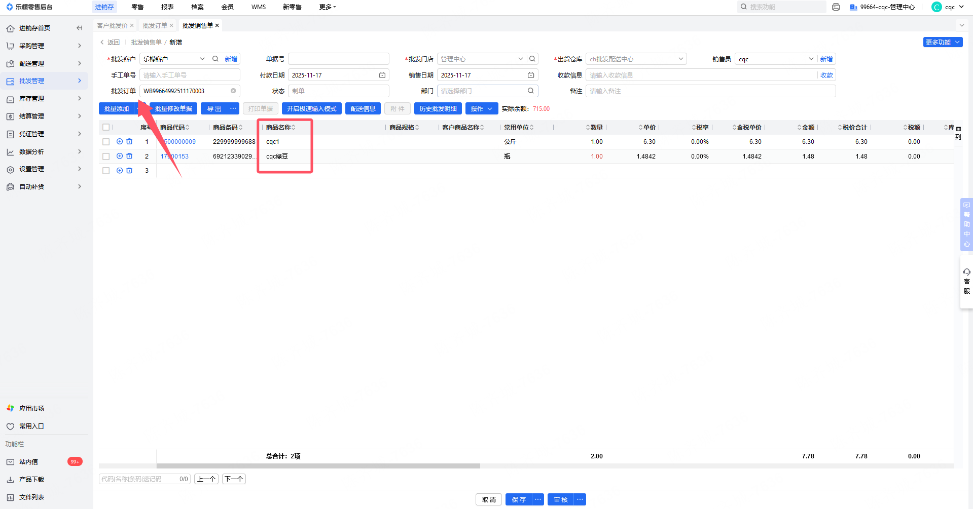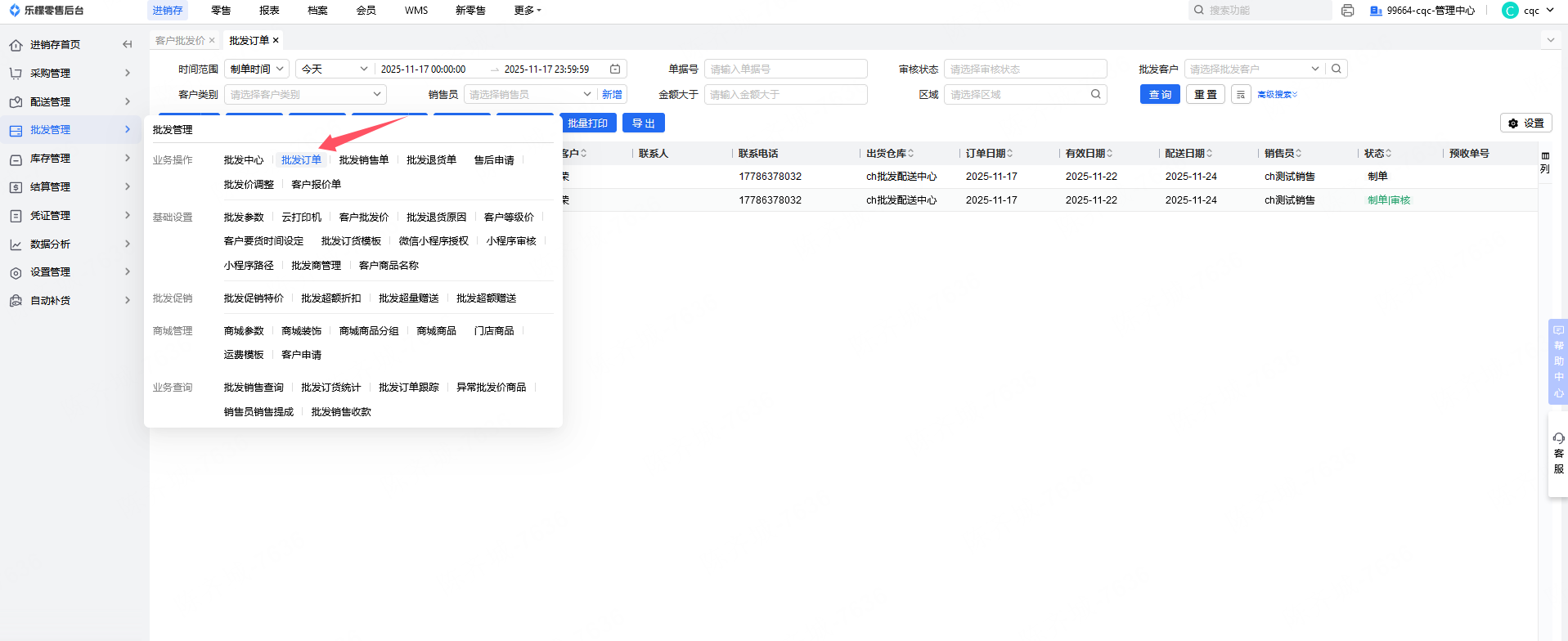 👉【操作路径】:进销存-批发管理-业务操作-批发销售单