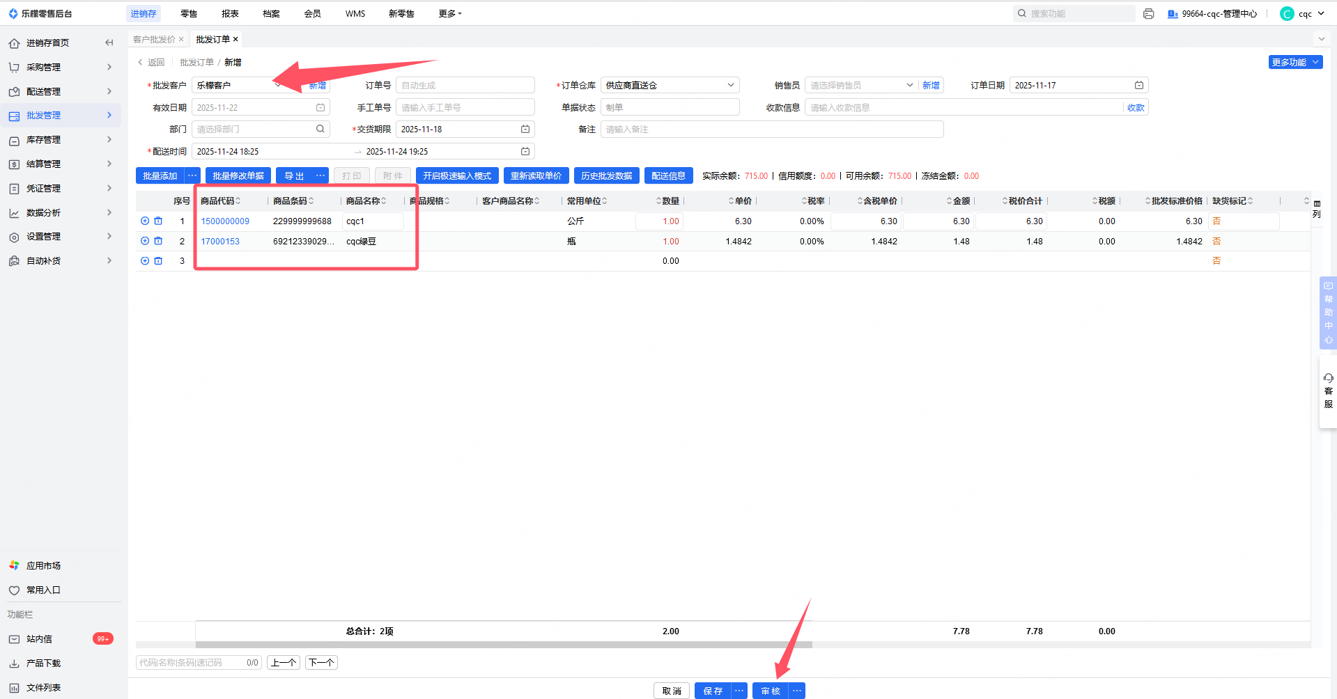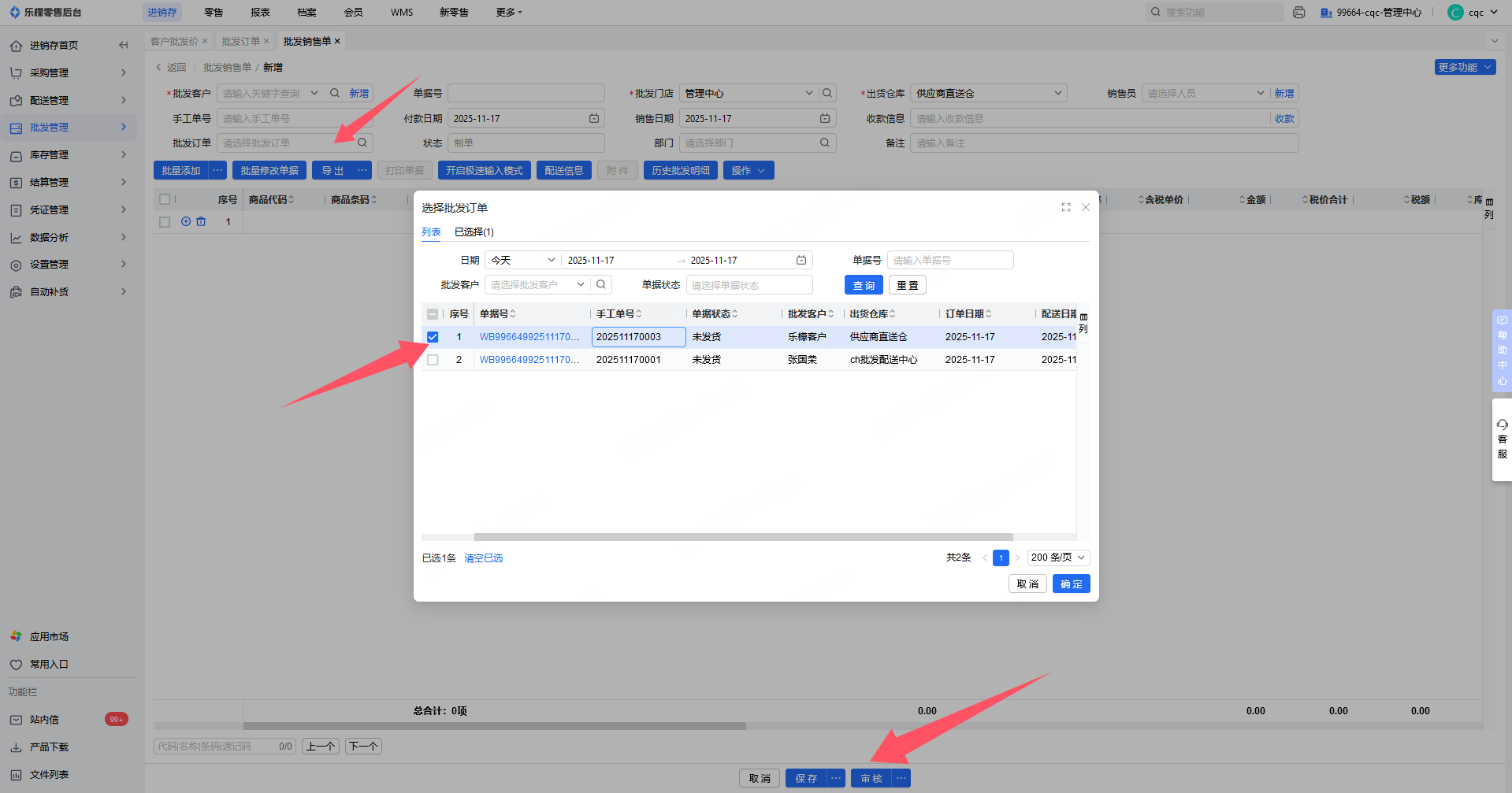 确认批发商所需商品后,到批发订单中进行新增批发订单,选择对应批发商和所需商品后点击保存并审核
