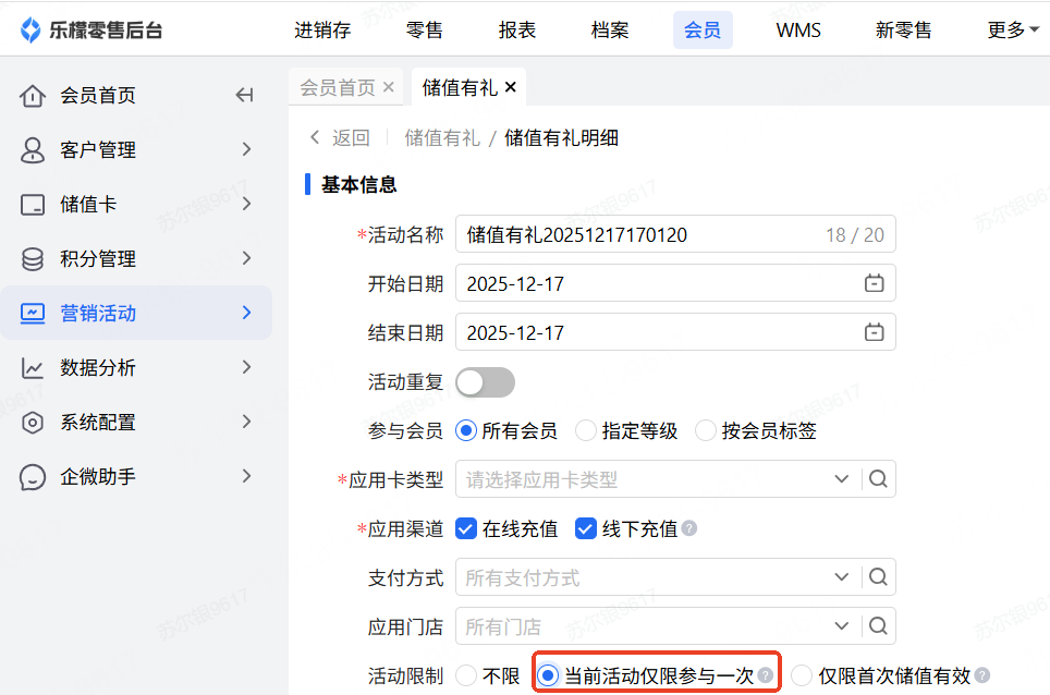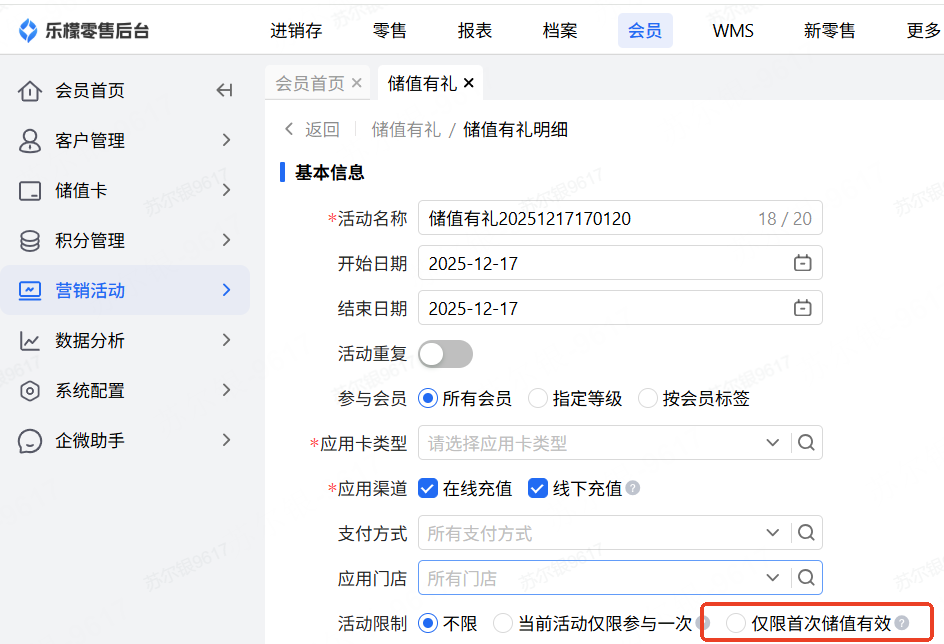 活动生效期间第一次充值不生效 | 勾选的是:仅限首次储值有效 此参数为会员卡第一次储值,而不是本次活动第一次储值 | 修改成:当前活动仅限参与一次 |