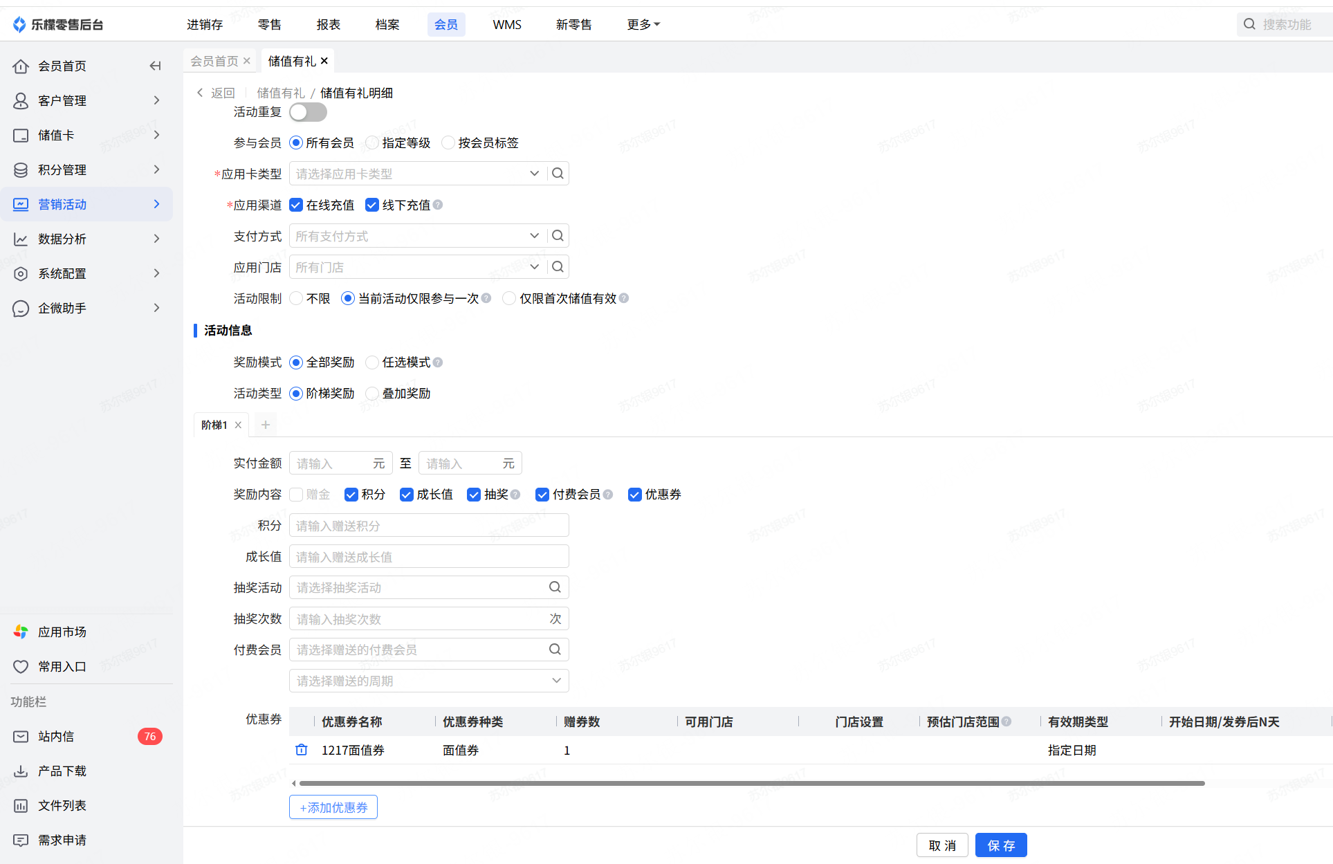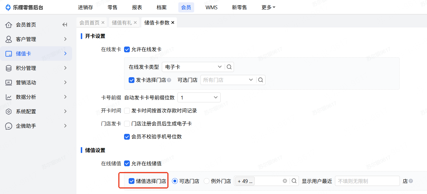线上充值设置了指定门店存款赠券,但充值时没有送券 | 储值卡参数没开启储值选择门店,在线上充值是固定充值门店是在管理中心的,但管理中心不在活动门店内所以不生效 | 根据所需情况设置 部分门店参与:开启储值选择门店即可 所有门店参与: 活动设置成所有门店参与即可 |