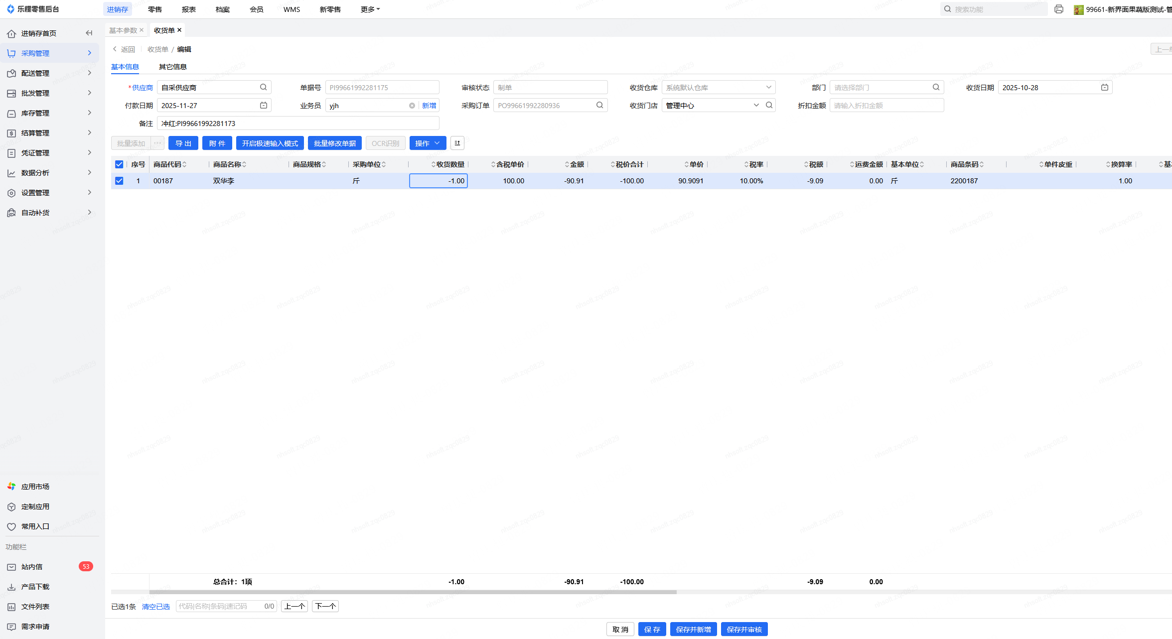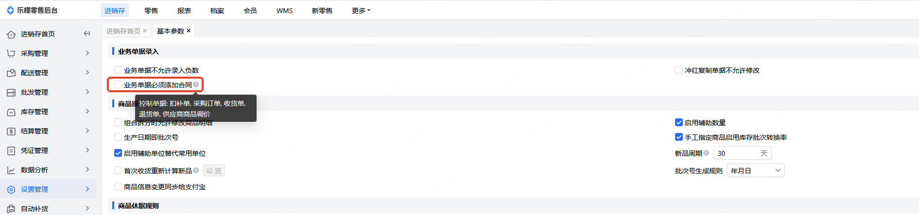 4.商超证书会多一个【业务单据必须添加合同】参数,勾选后业务单据必须关联的供应商合同后才能保存