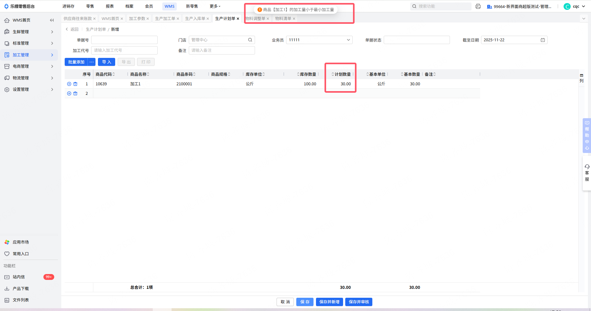 新增生产计划单,数量填写30,保存生产计划单时会提示不允许保存