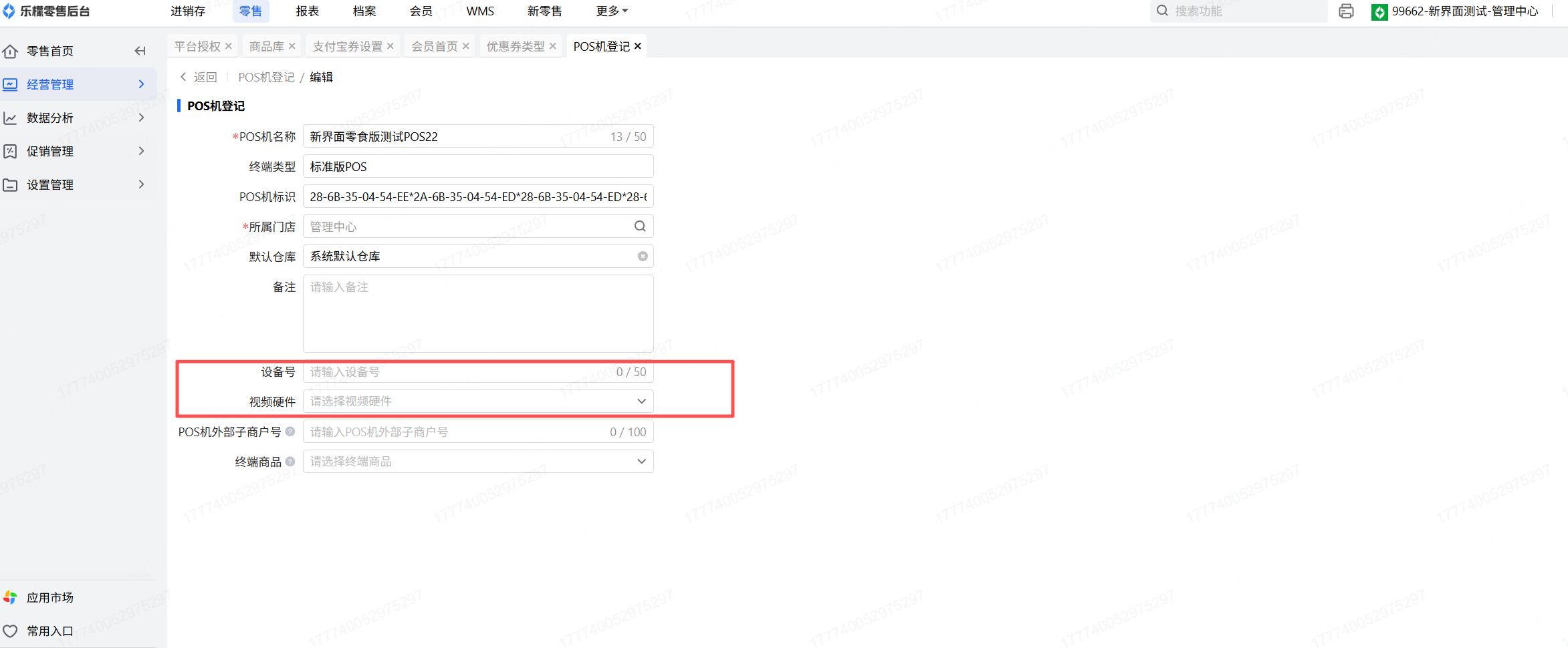 3、乐檬WEB后台-零售-POS机登记-选择需要绑定的POS机。