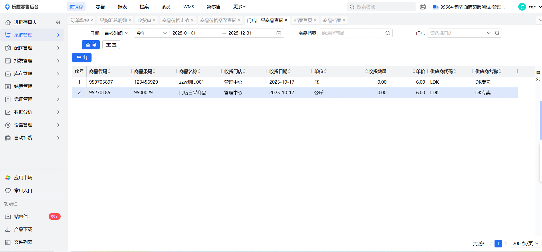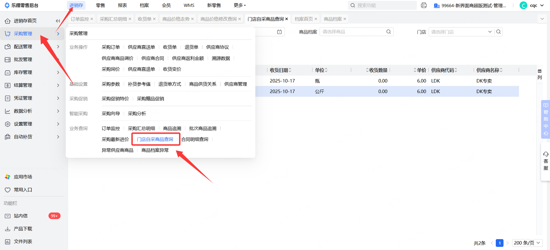 👉【操作路径】:·进销存-采购管理-业务查询-门店自采商品查询