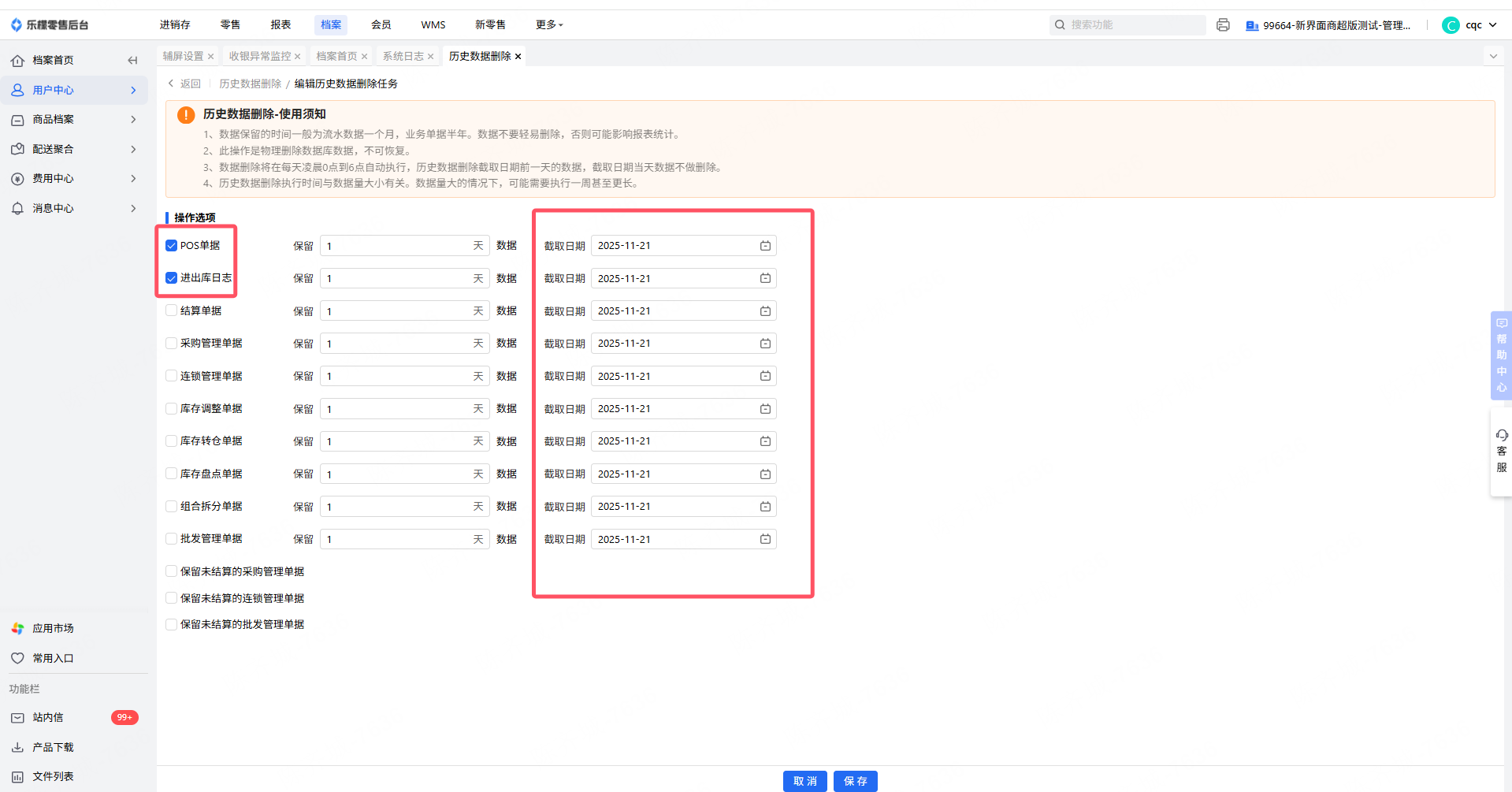 》保留日期,截取日期:所选日期单据不会被删除,任务执行删除之前的日期的数据;