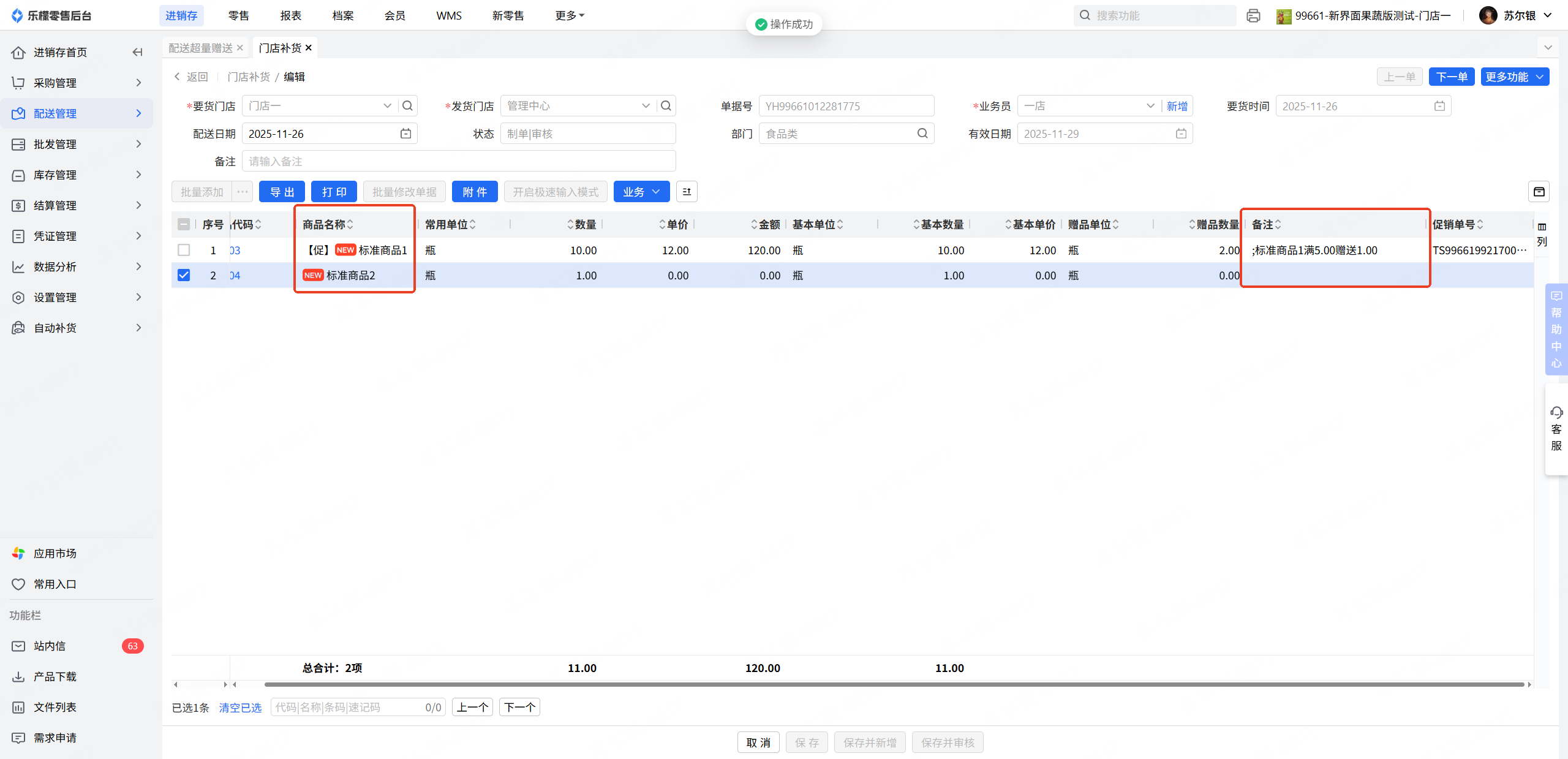 门店要货单审核后会在要货单单据明细里添加赠送的商品,如下图所示,【标准商品1】因为要货赠送的也是【标准商品1】,所以直接在【农场苹果】这一行填充赠品单位,赠品数量和备注(备注来自【配送超量赠送】);
