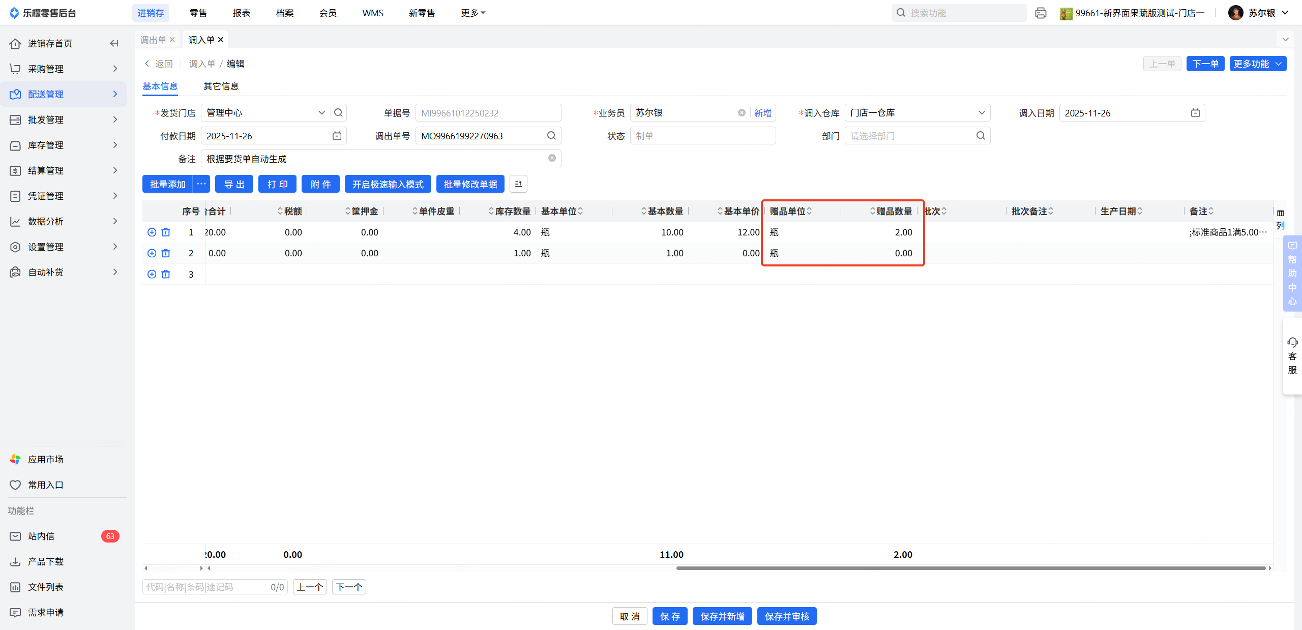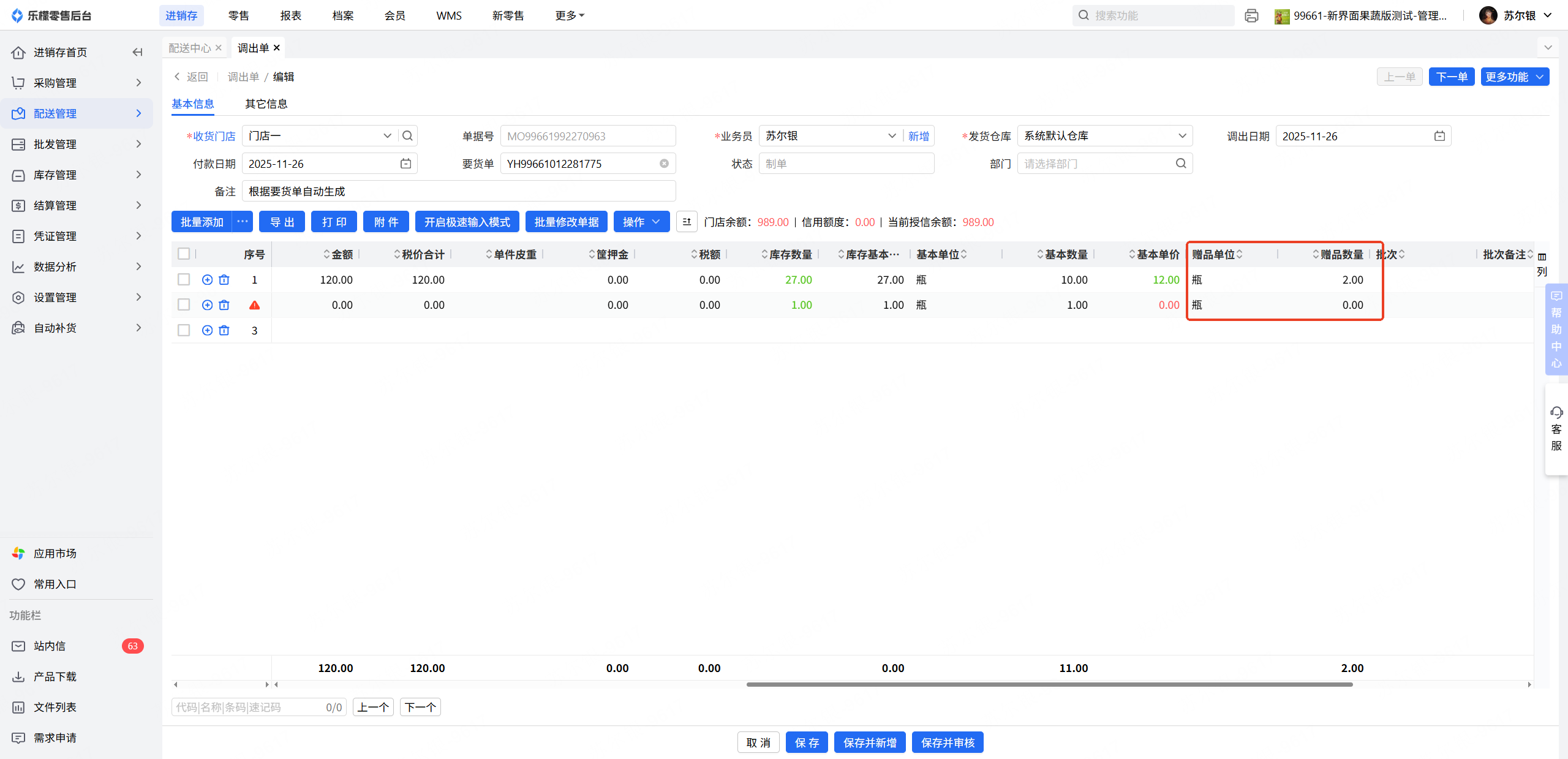 3.配送中心依照要货单生成调出单,调出单里也会存在要货赠送的赠品: