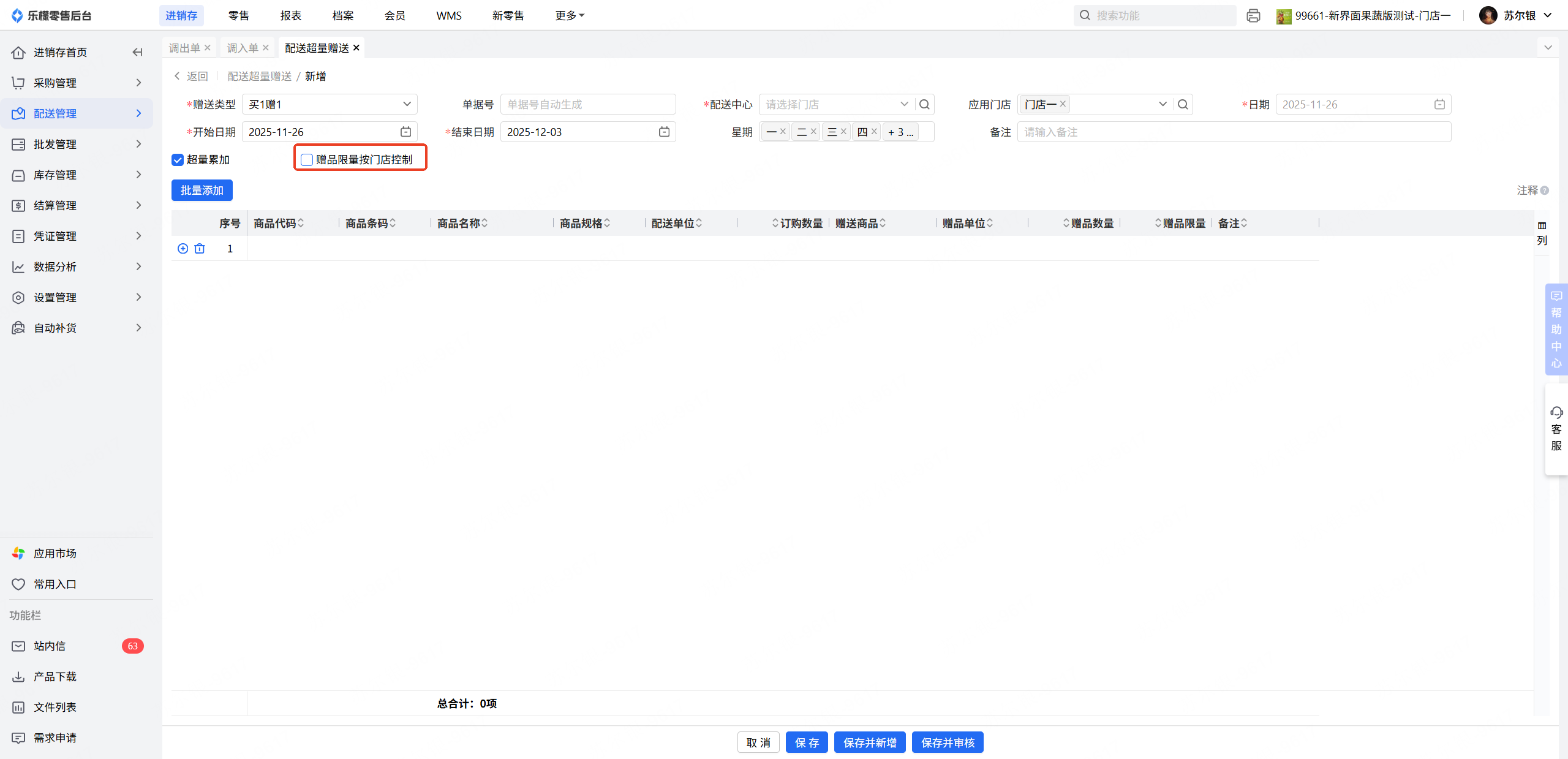 注意:【配送超量赠送】里添加批次商品,那么该商品的所有批次都会应用配送超量赠送规则,因为门店要货没有批次一说。