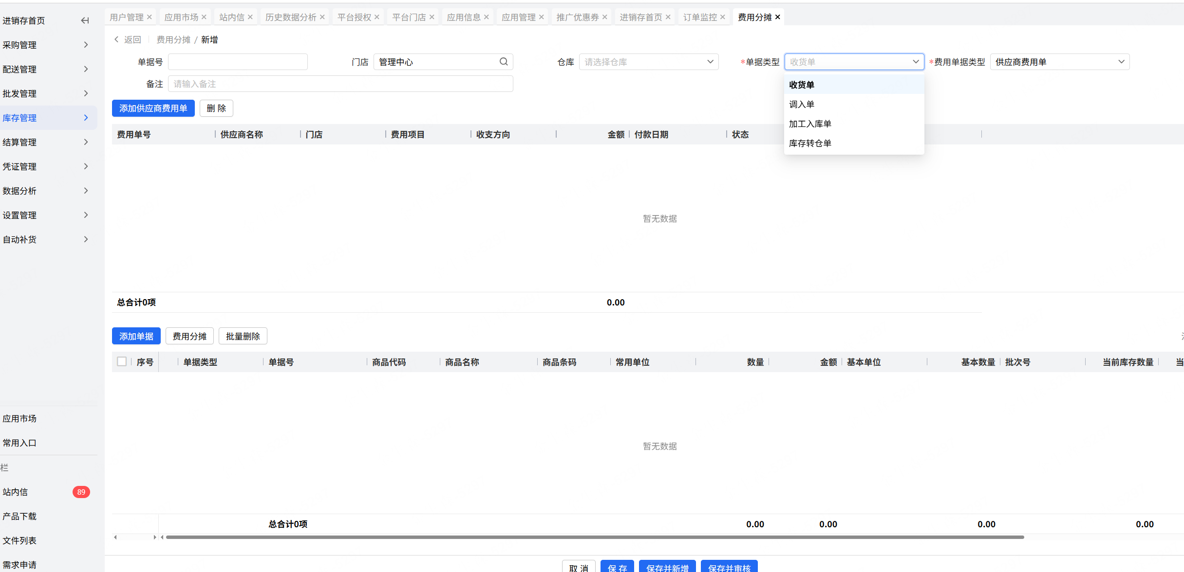 进销存-库存管理-费用分摊,点击“新增”单据,选择门店,选择可用于分摊的单据类型:收货单、调入单、加工入库单、库存转仓单