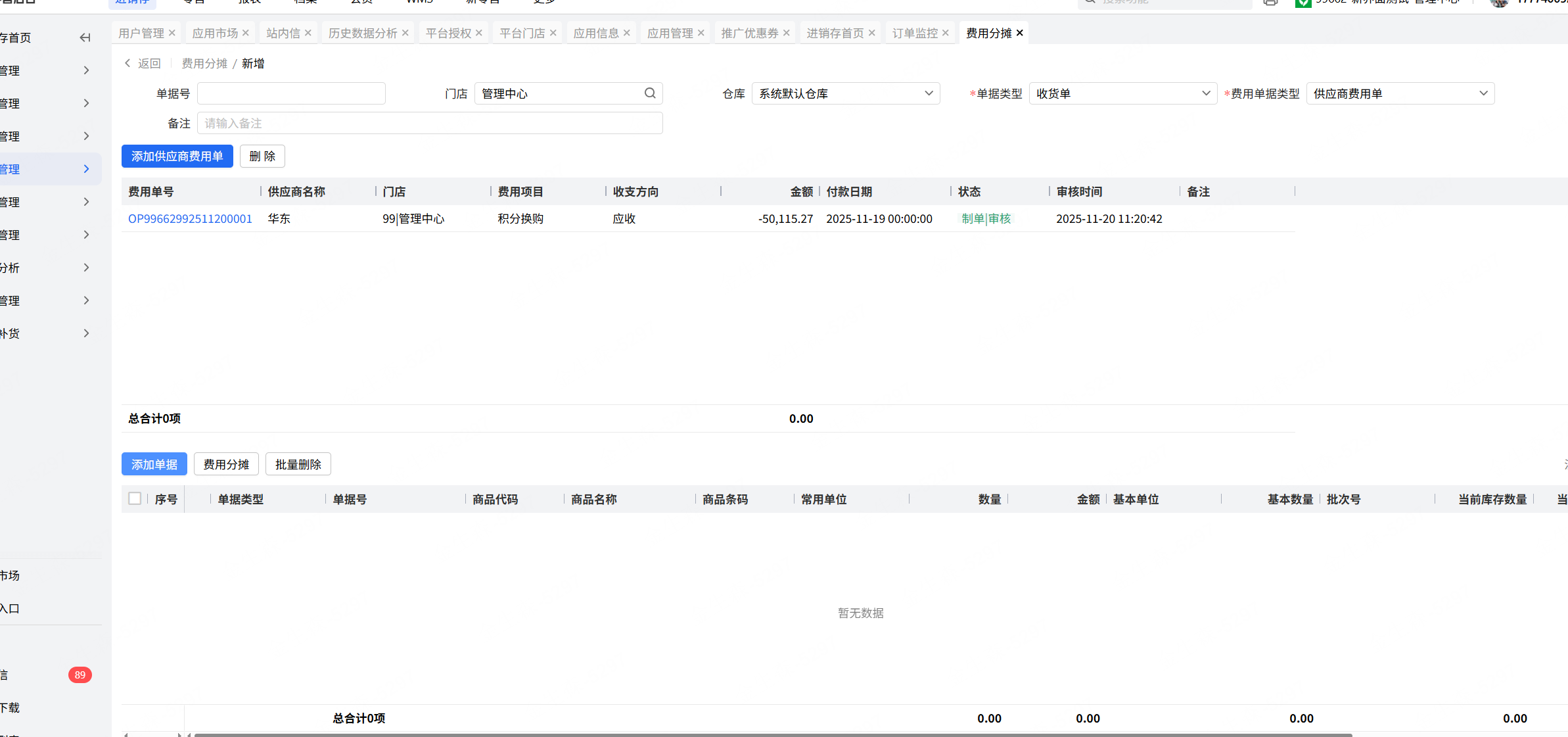 1、仅支持已审核状态、应付方向、分摊单所选门店的费用单