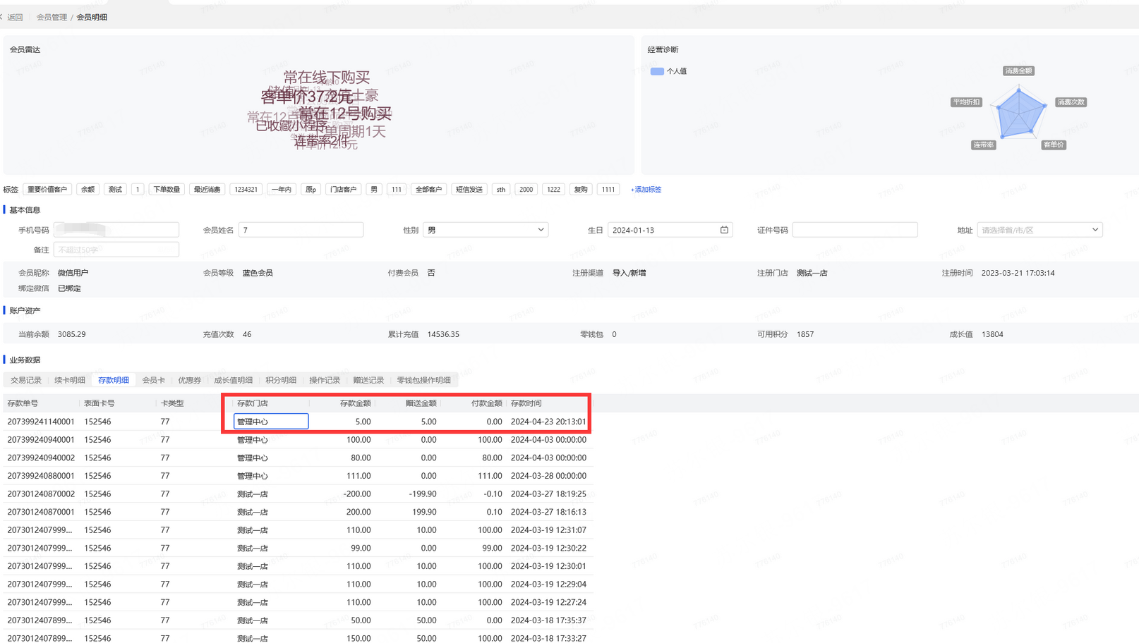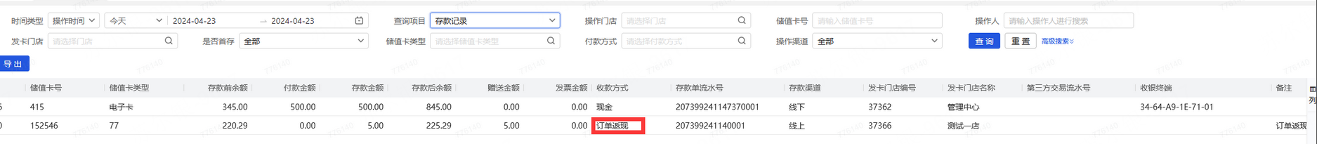 返现金额直接回到顾客的储值卡中,可在储值卡操作记录-存款记录中查询,也可以在会员储值卡明细中查看
