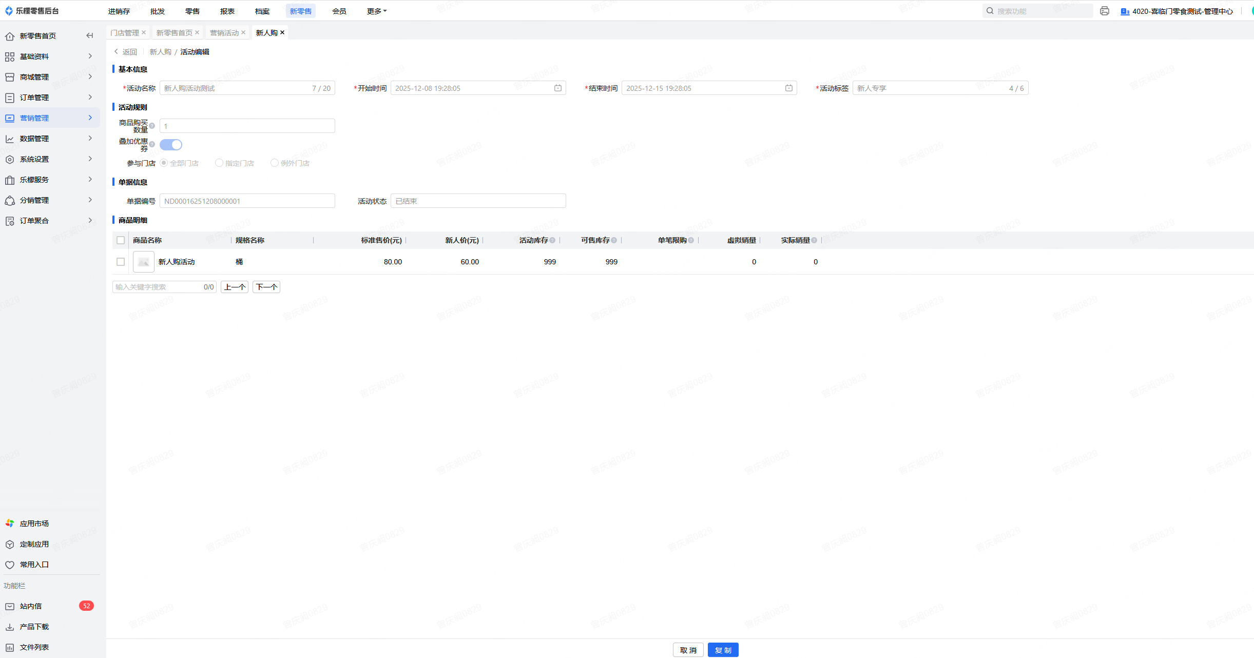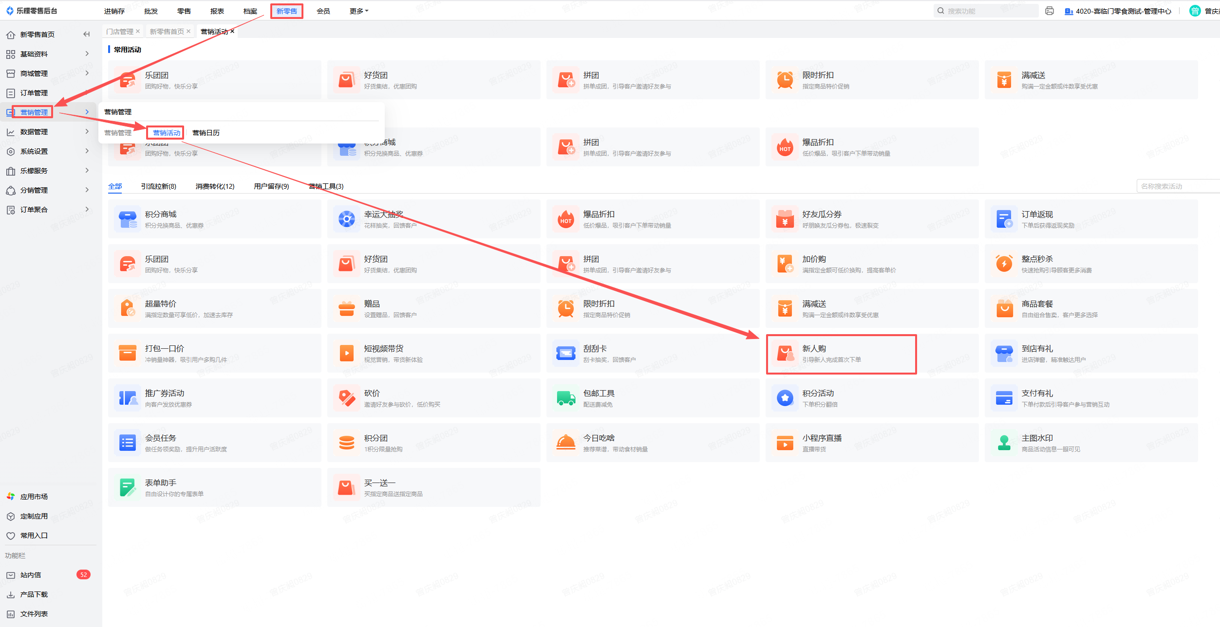 👉【操作路径】:·新零售-营销管理-营销活动-新人购
