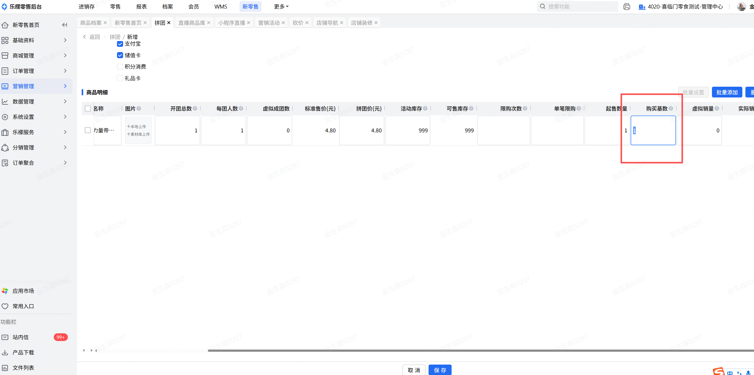👉【操作路径】:·新零售-营销管理-营销活动-拼团-活动详情-商品明细=购买基数