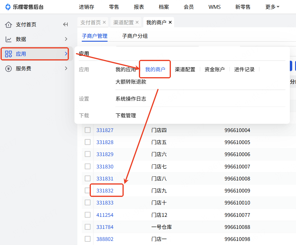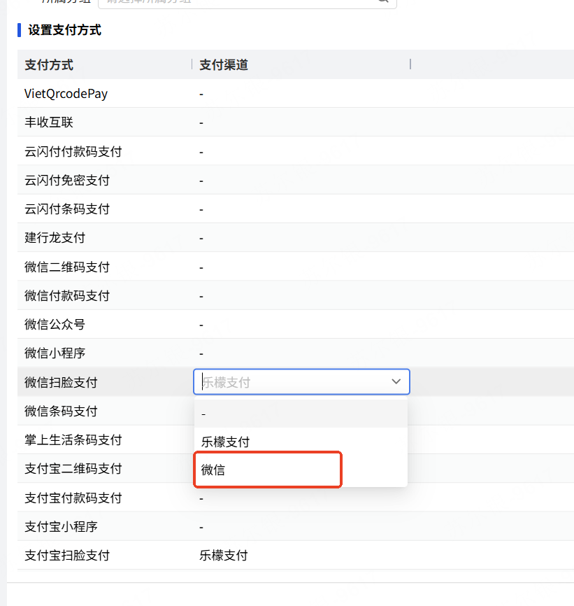 进入支付-应用-我的商户-进入到需要配置微信支付的子商户中,将微信条码支付修改为“微信”即可