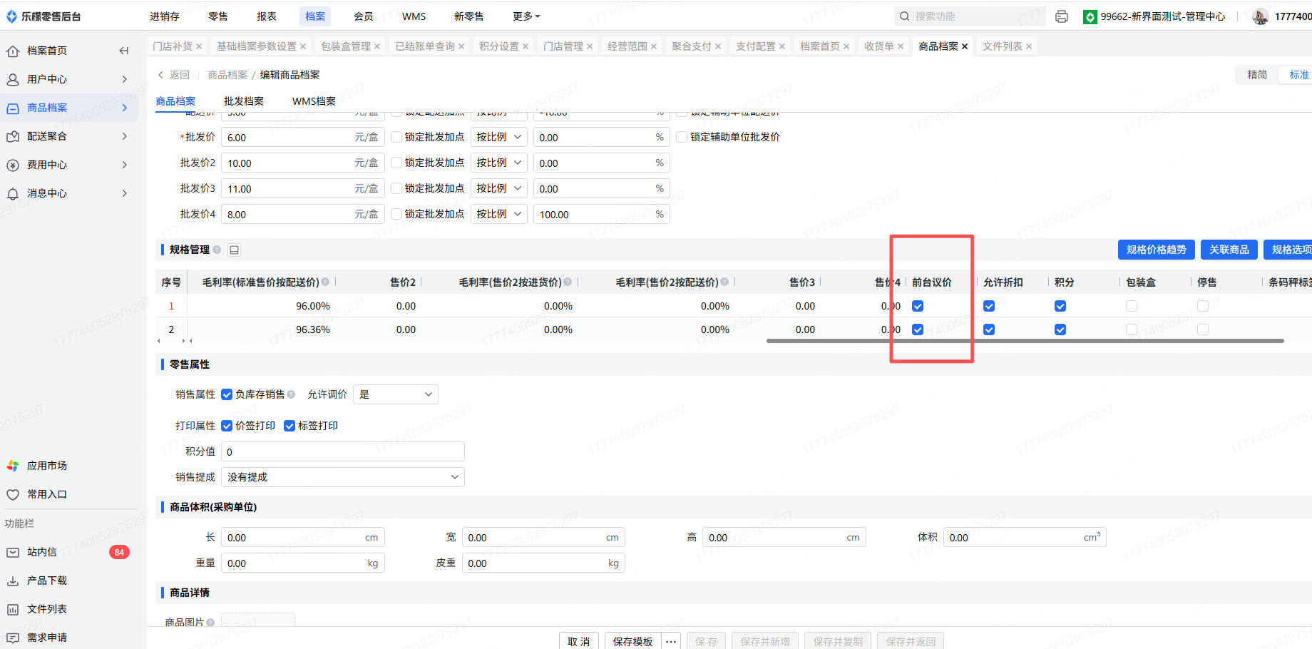 👉【操作路径】:·档案-商品档案-规格管理-前台议价
