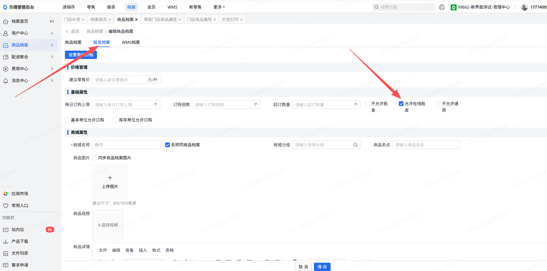 👉【操作路径】:·档案-商品档案-批发档案-基础属性-允许在线批发
