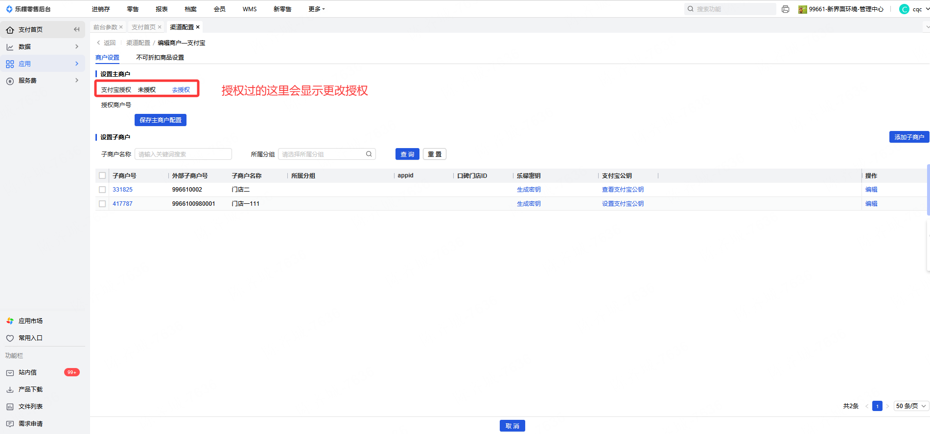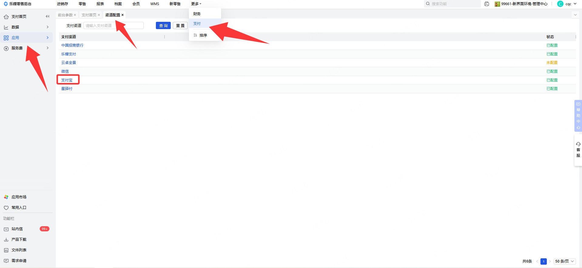 👉【操作路径】:1.更多-支付-应用-渠道配置-支付宝