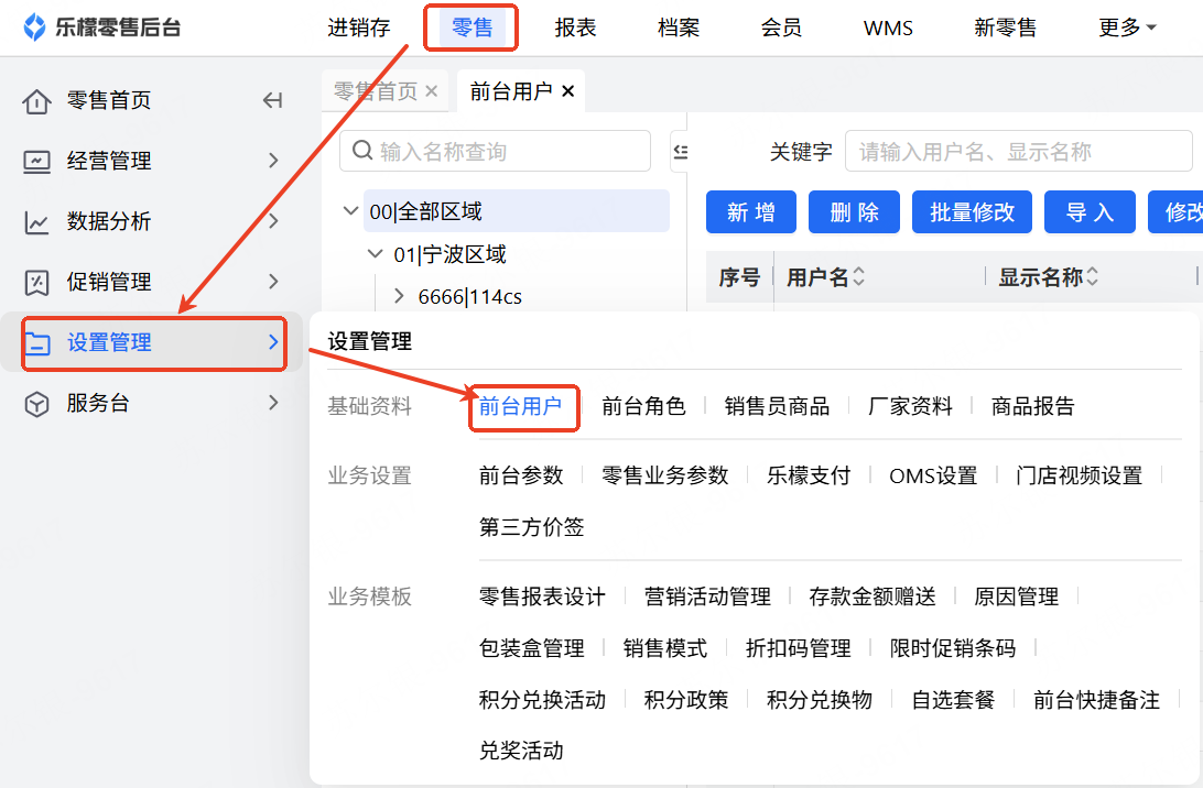 👉【操作路径】:·乐檬web后台-档案-设置管理-前台用户