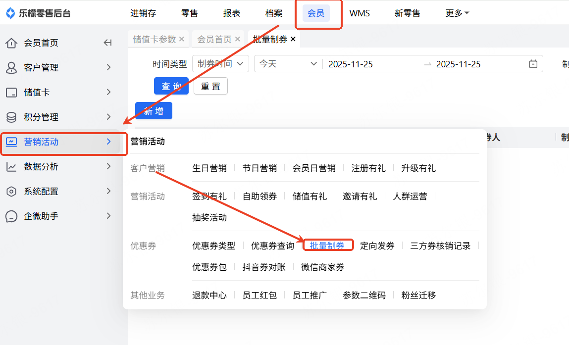 👉【操作路径】:·会员-营销活动-批量制券