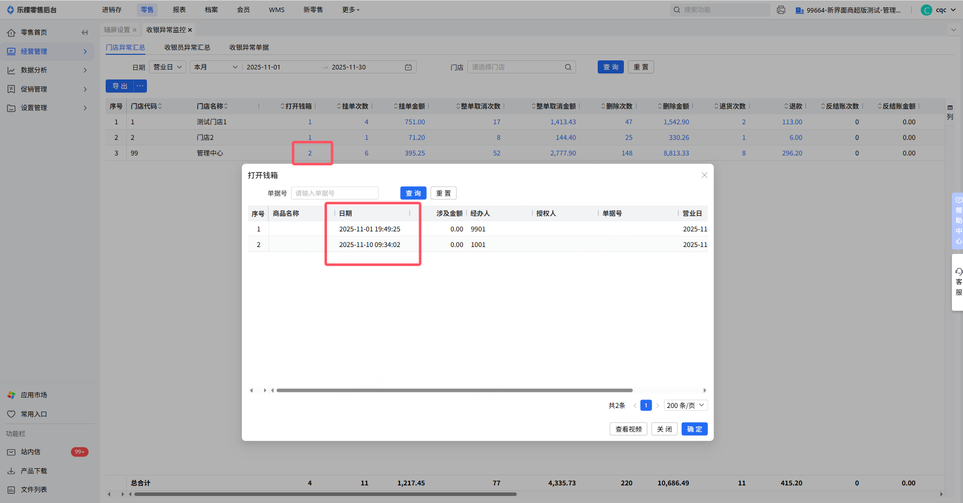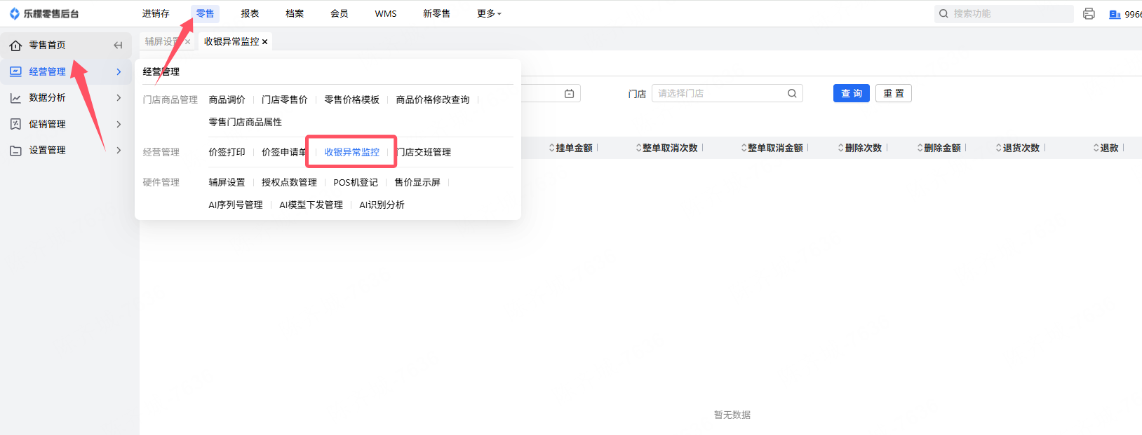 👉【操作路径】:·零售-经营管理-收银异常监控