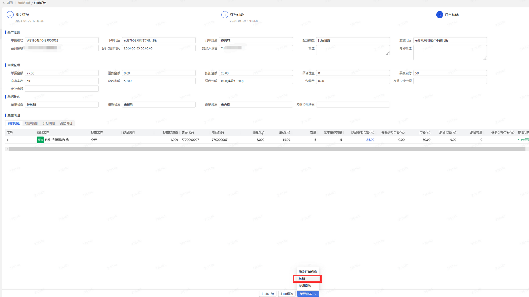 👉【操作路径】:·新零售-销售订单-更多操作-核销