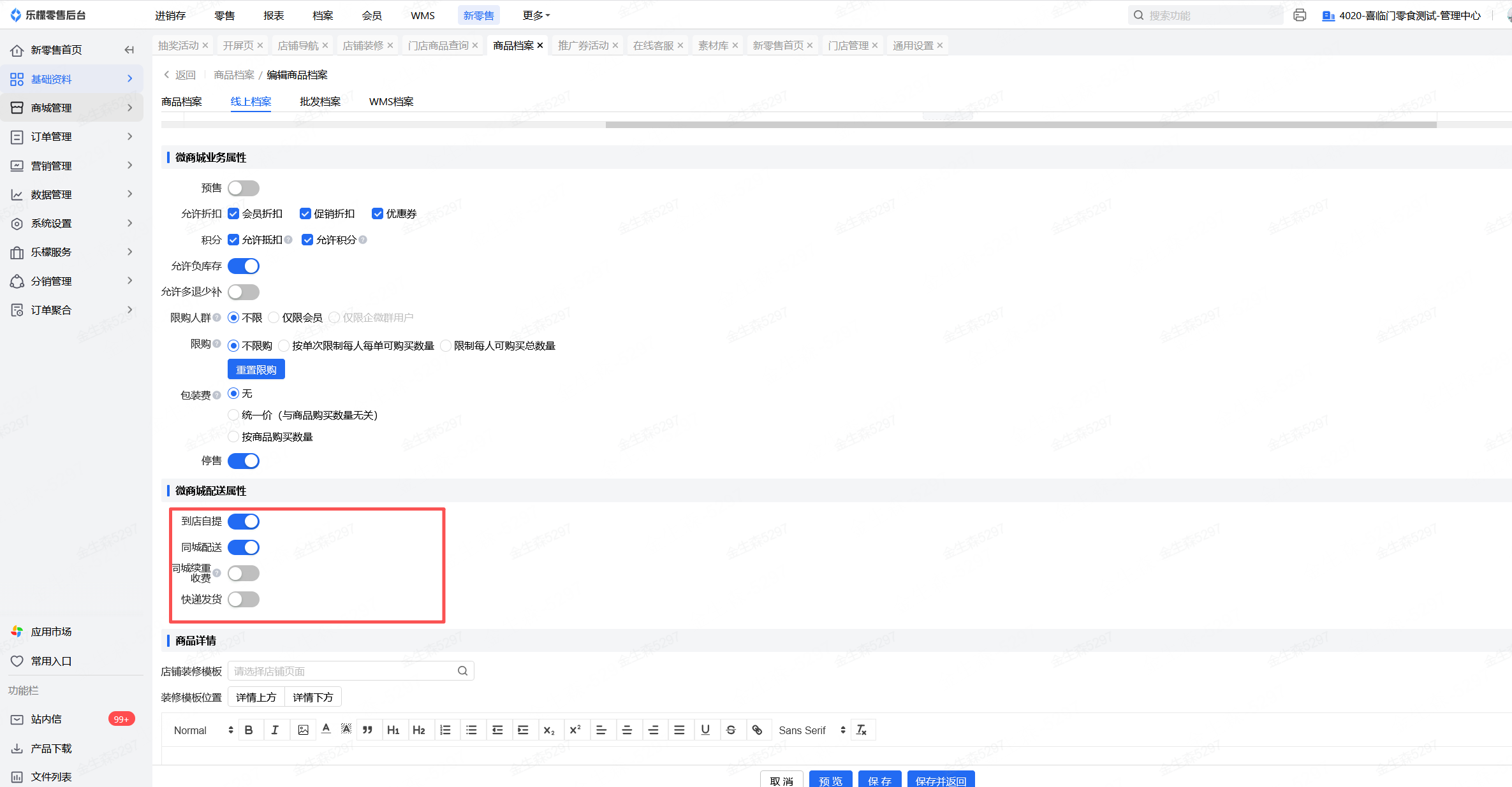 👉【操作路径】:·新零售-商品档案-微商城配送属性-配送方式
