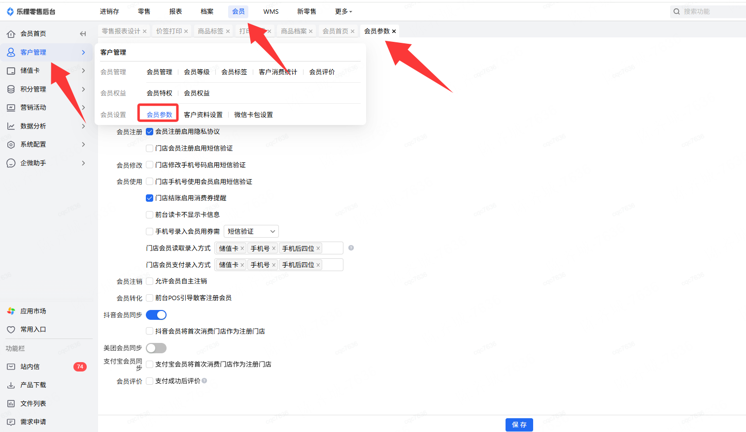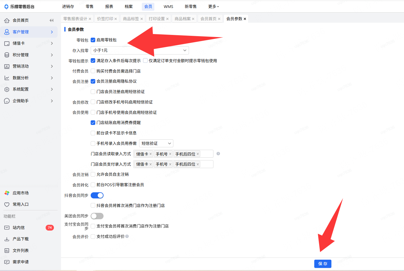 👉【操作路径】:会员-客户管理-会员参数-启用零钱包