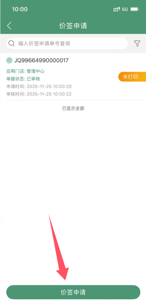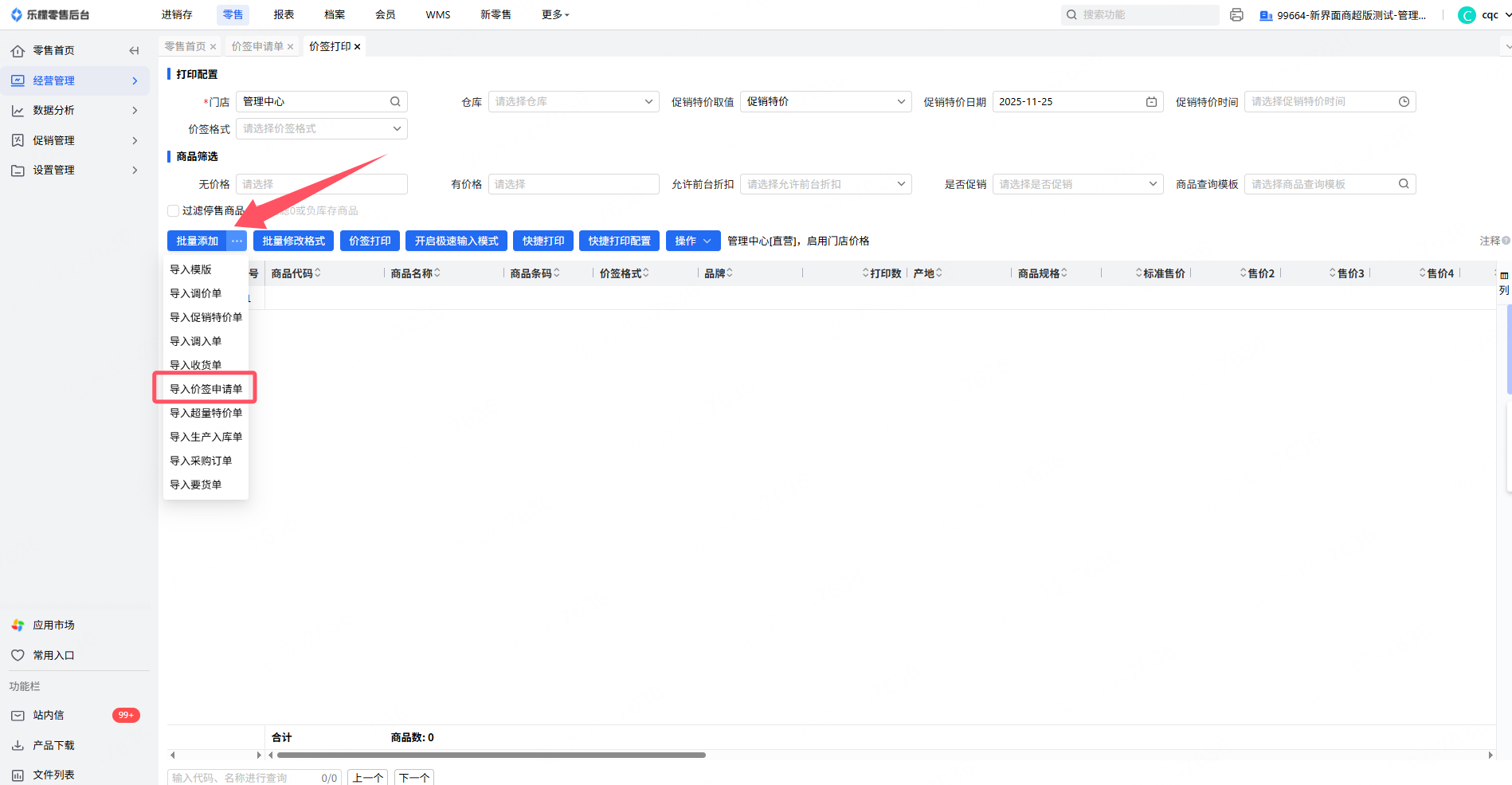 2.可以后台零售-经营管理-价签申请单里找到单据点打印也可以直接去价签打印里批量添加(三个点)导入价签申请单