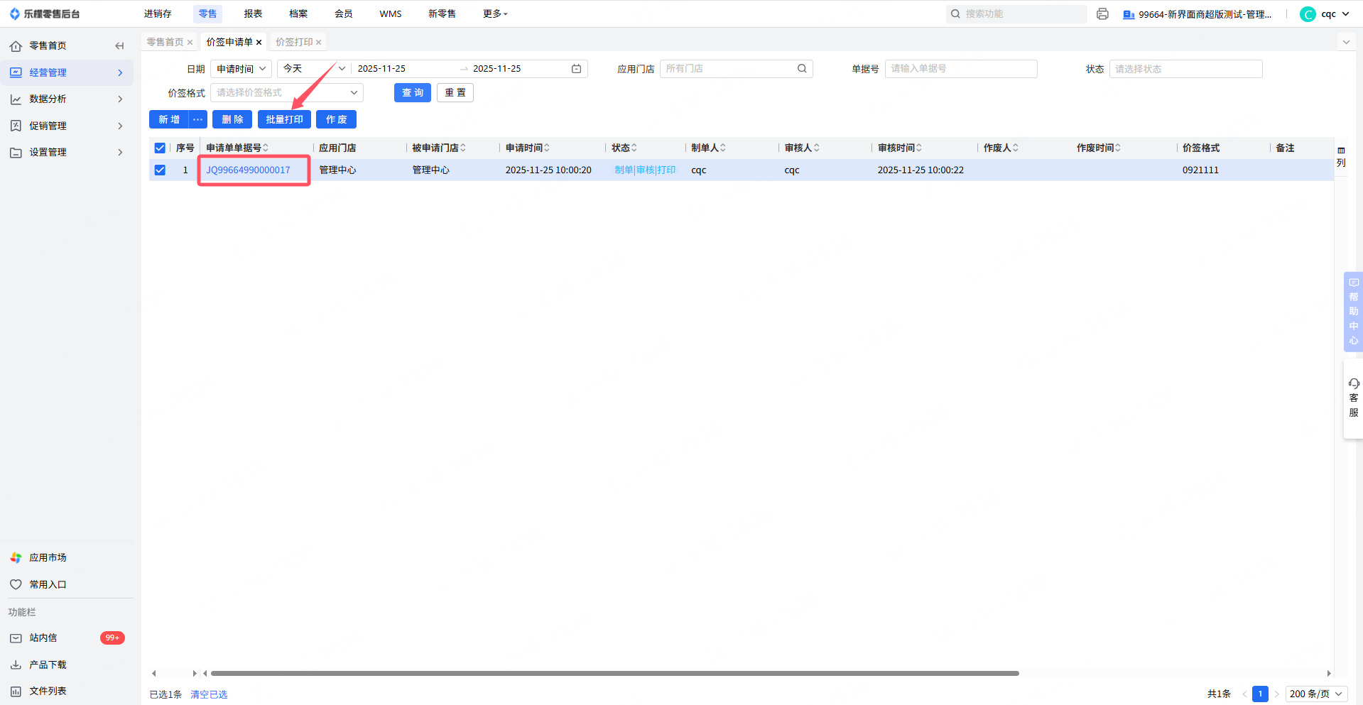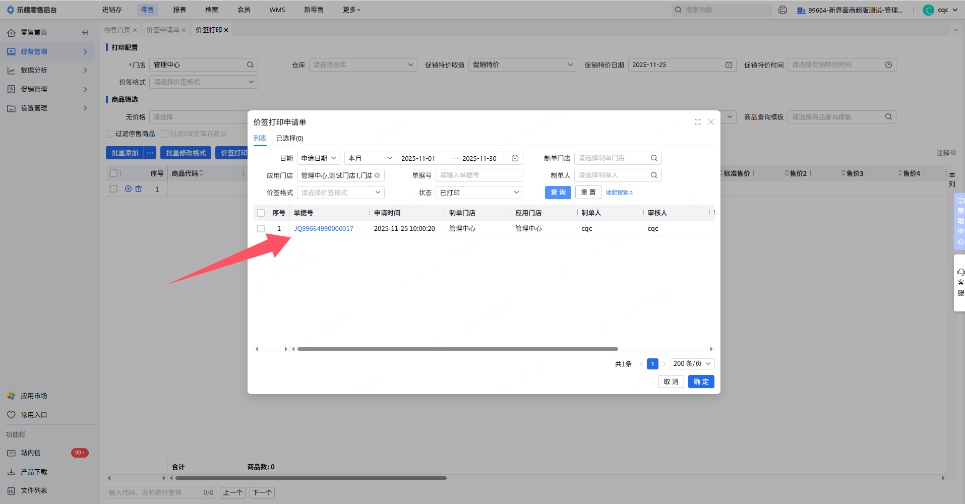 3.批量添加-导入价签申请,然后就能找到对应员工申请的单据点击单据确认即可,可以通过制单人,门店等筛选快速搜索到单据,进行选择打印
