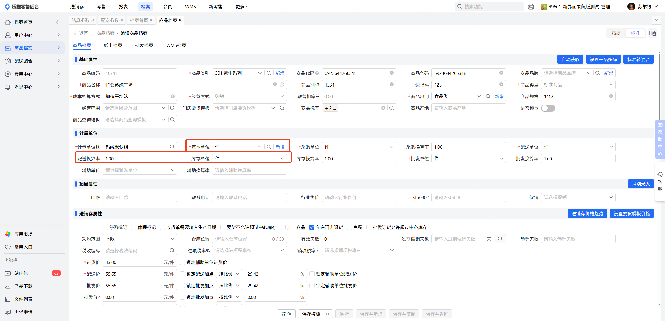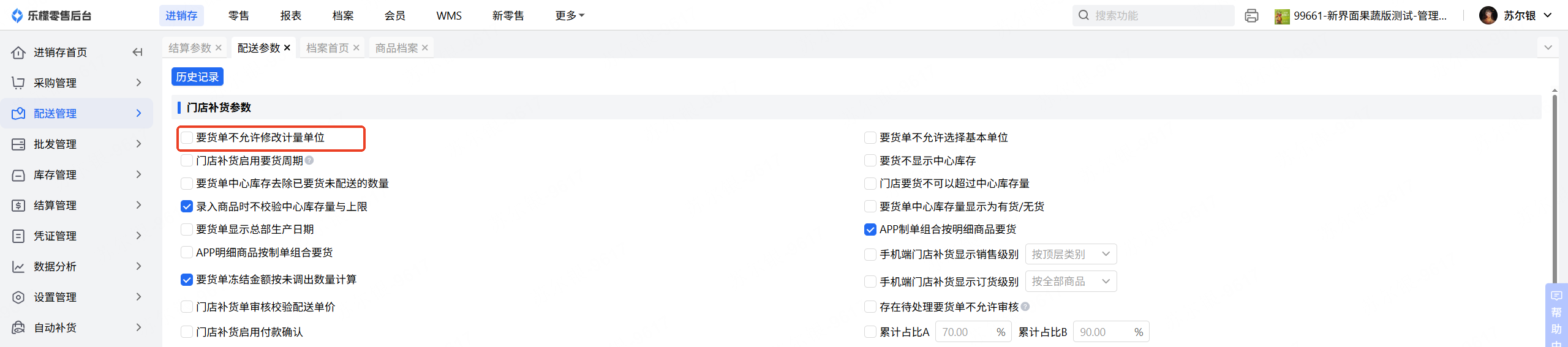 情况2,若商品档案设置无问题,需要检查 配送管理-配送参数,是否开启了要货单不允许修改计量单位