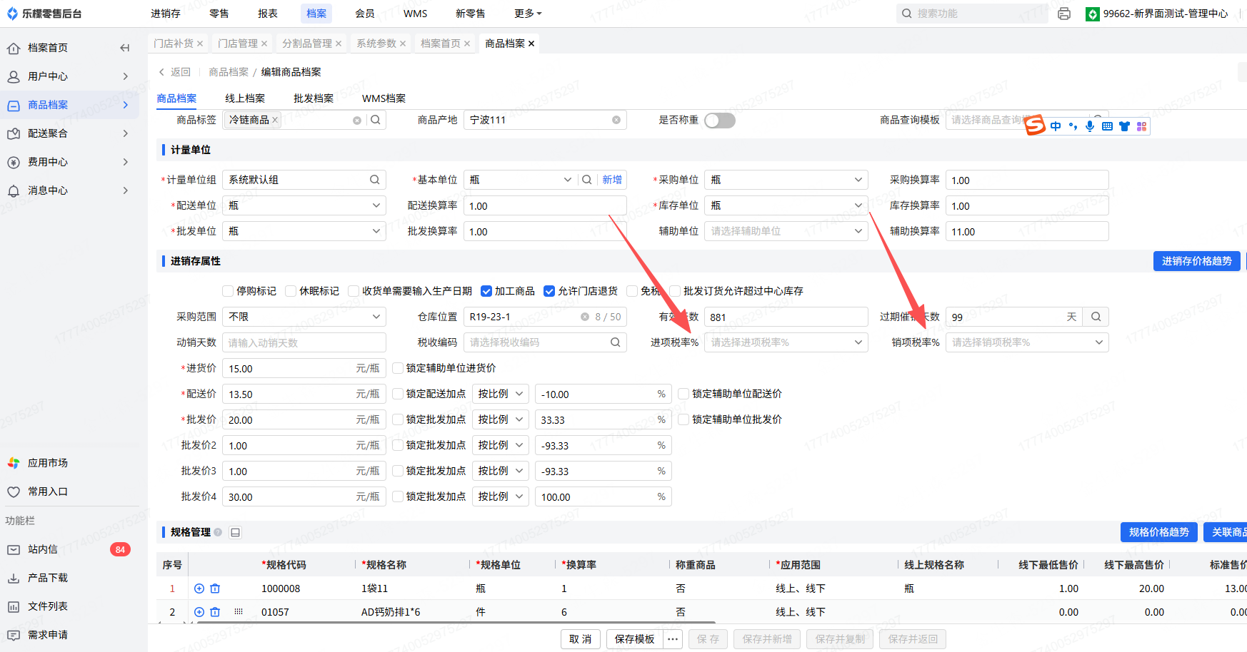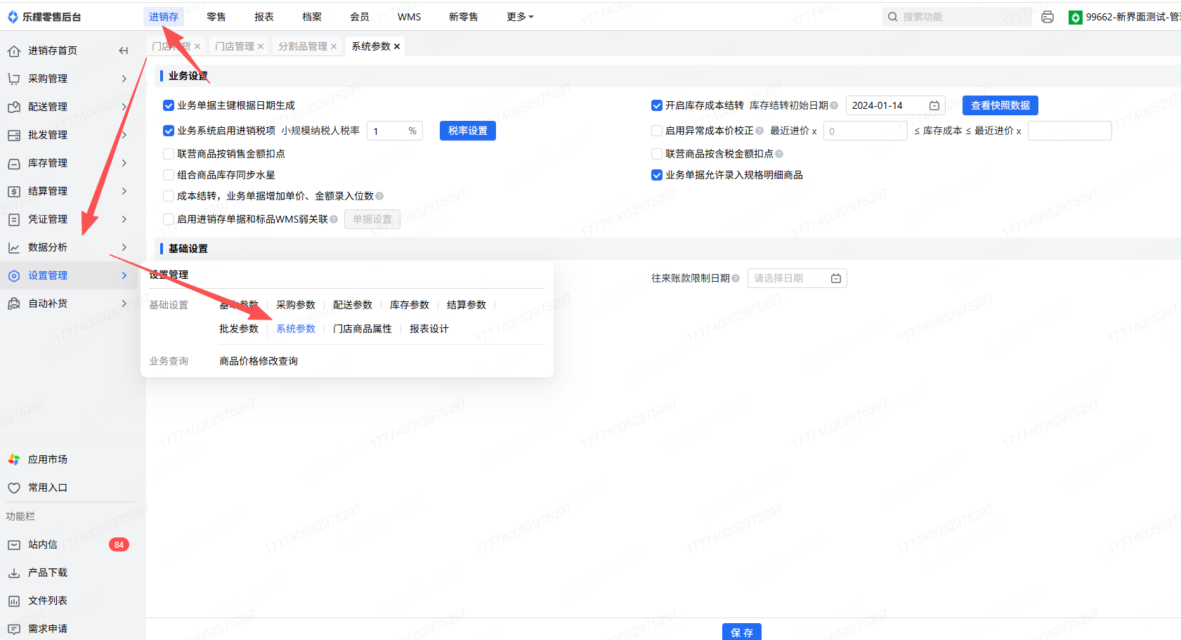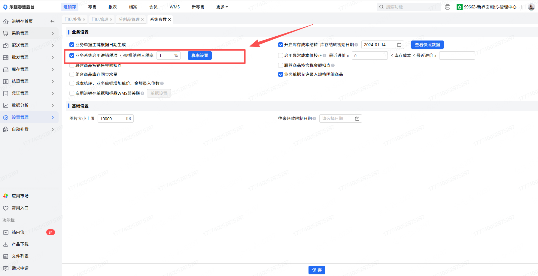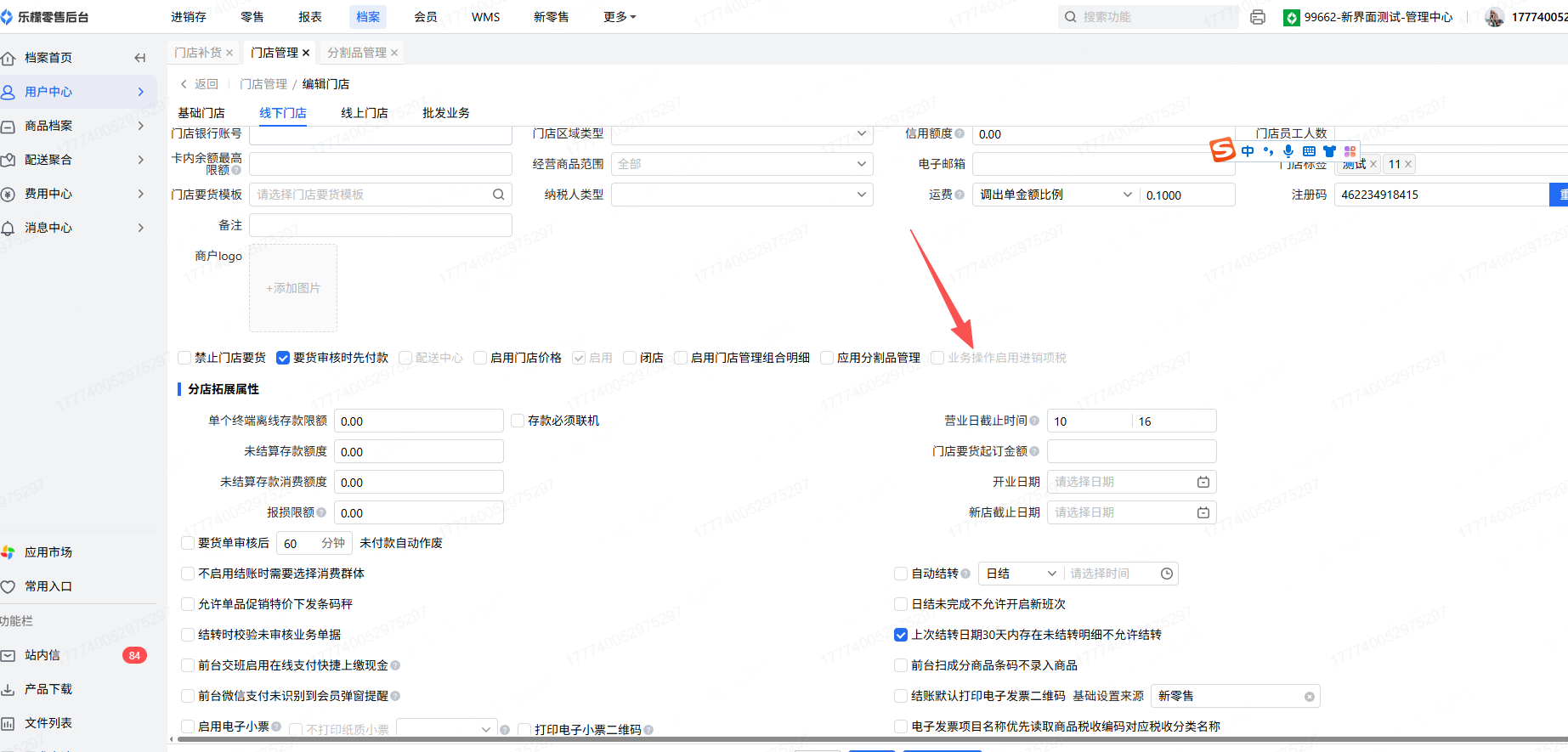 2.然后在需要启用税率的门店勾选【业务操作启用进销项税】,那么该门店的采购,配送,批发,前台销售流程就会使用进销项税