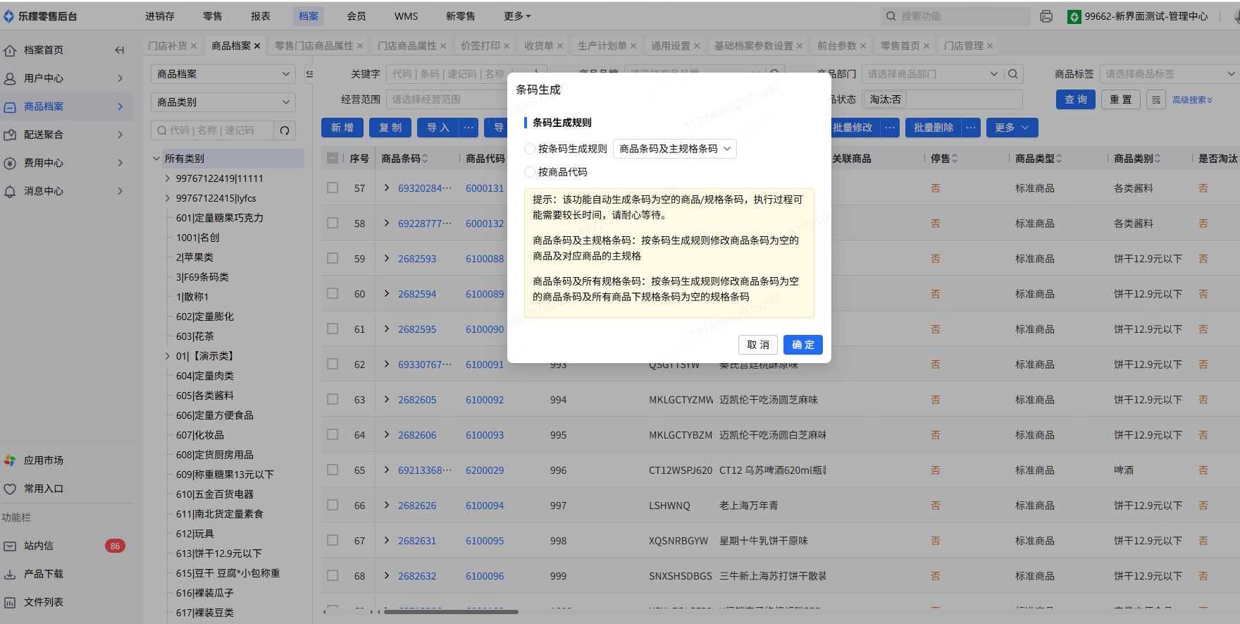 提示:该功能自动生成条码为空的商品条码,执行过程可能需要较长时间,请耐心等待。