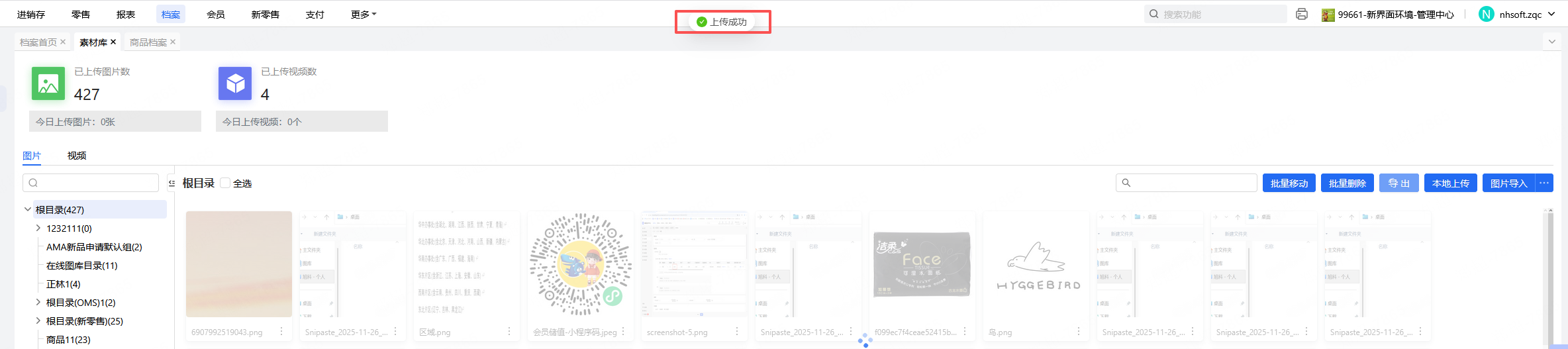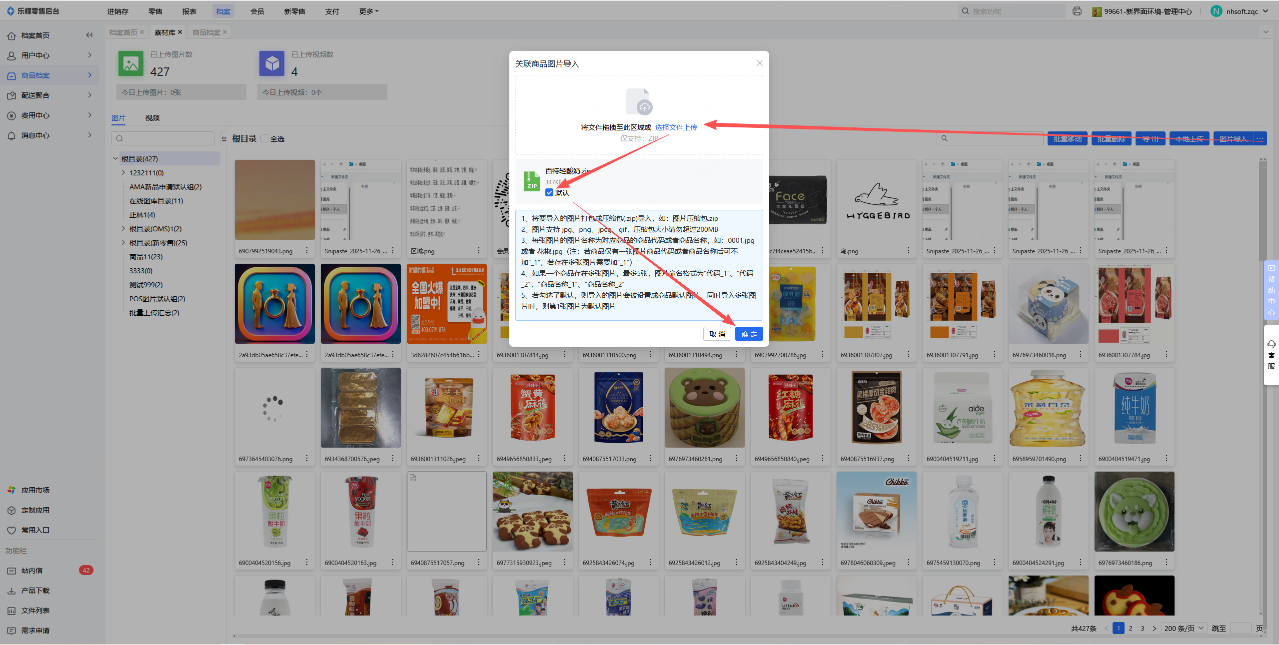 素材库-点击“图片导入”右边三个小点,有下拉框选项,选择关联商品图片导入