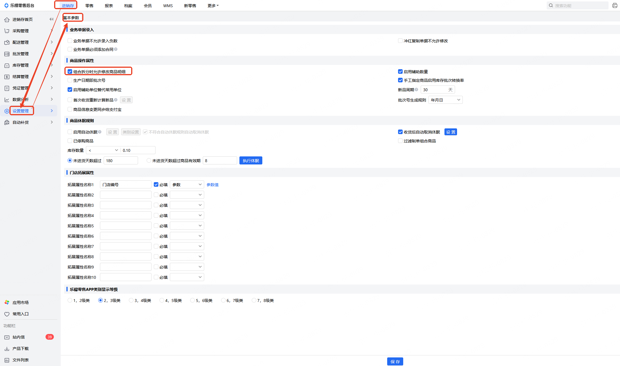 进销存-设置管理-基本参数-组合拆分时允许修改商品明细