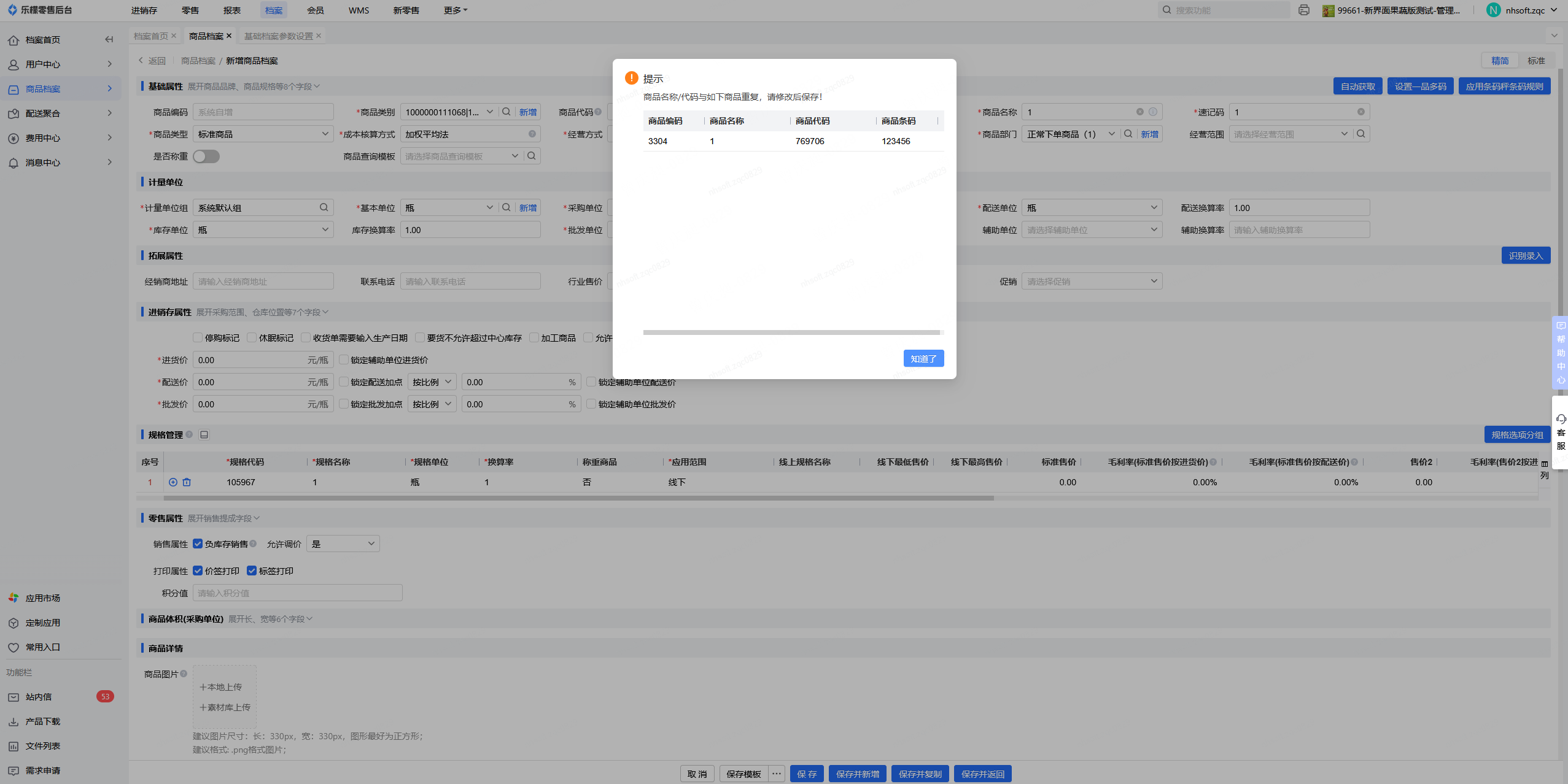 未开启的情况下,新建档案也会提示条码已存在,点确定后能正常新增