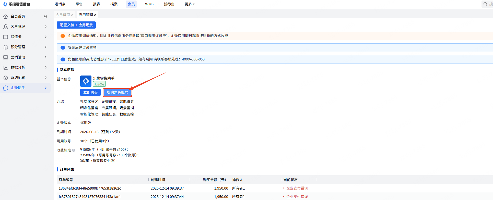 需要在企微助手中购买互通角色账号,且等待服务商支付完成(约1~3个工作日)